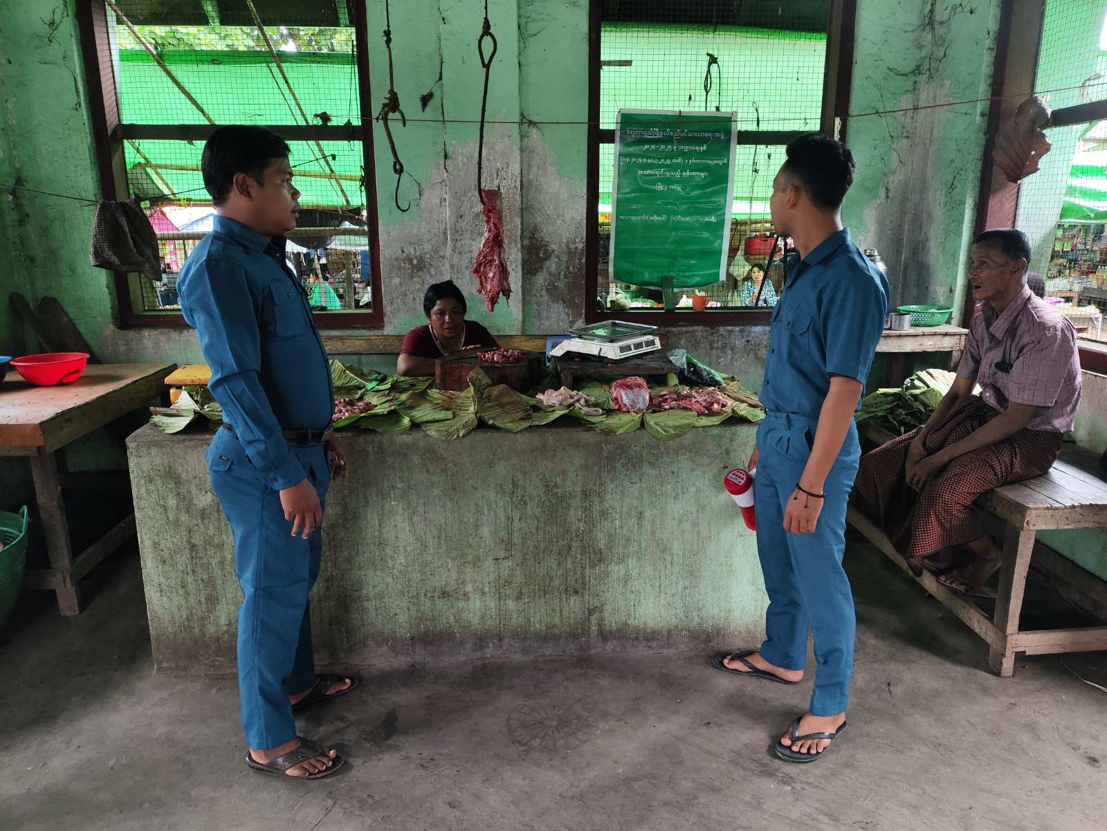 ထိုသို့စစ်ဆေးရာ အခြေခံစားသောက်ကုန် ဆန်၊ ဆီ၊ အသား ၊ ငါး ၊ ဥ ၊ မီးဖိုချောင်သုံးပစ္စည်းများနှင့် ဟင်းသီးဟင်းရွက်များ၊ သစ်သီးဝလံများကို ထိုက်သင့်သည့် စျေးနှုန်းတစ်ခု သတ်မှတ်၍ ရောင်းချပေးလျက်ရှိရာ ကုန်စိမ်း သား/ငါးစျေးအတွင်း ရောင်းချနေသည့် စျေးသူ၊ စျေးသားများ အနေဖြင့် အခြေခံစားသောက်ကုန်များကို သက်ဆိုင်ရာ ကုန်စျေးနှုန်း တည်ငြိမ်ရေးလုပ်ငန်းအဖွဲ့မှ သတ်မှတ်ထားသည့် စျေးနှုန်းထက် ပိုမိုမြှင့်တင်ရောင်းချခြင်း၊ အလေးချိန်၊ အရည်အသွေး ပြည့်ဝစွာ ရောင်းချခြင်းမရှိသည်ကို တွေ့ရှိပါက တည်ဆဲဥပဒေများနှင့်အညီ အရေးယူ ဆောင်ရွက်မှုများ ပြုလုပ်မည်ဖြစ်ကြောင်း သတိပေးခြင်းများ၊ တိုက်တွန်းနှိုးဆော်မှုများကို ပြုလုပ်ခဲ့ကြောင်း သိရသည်။