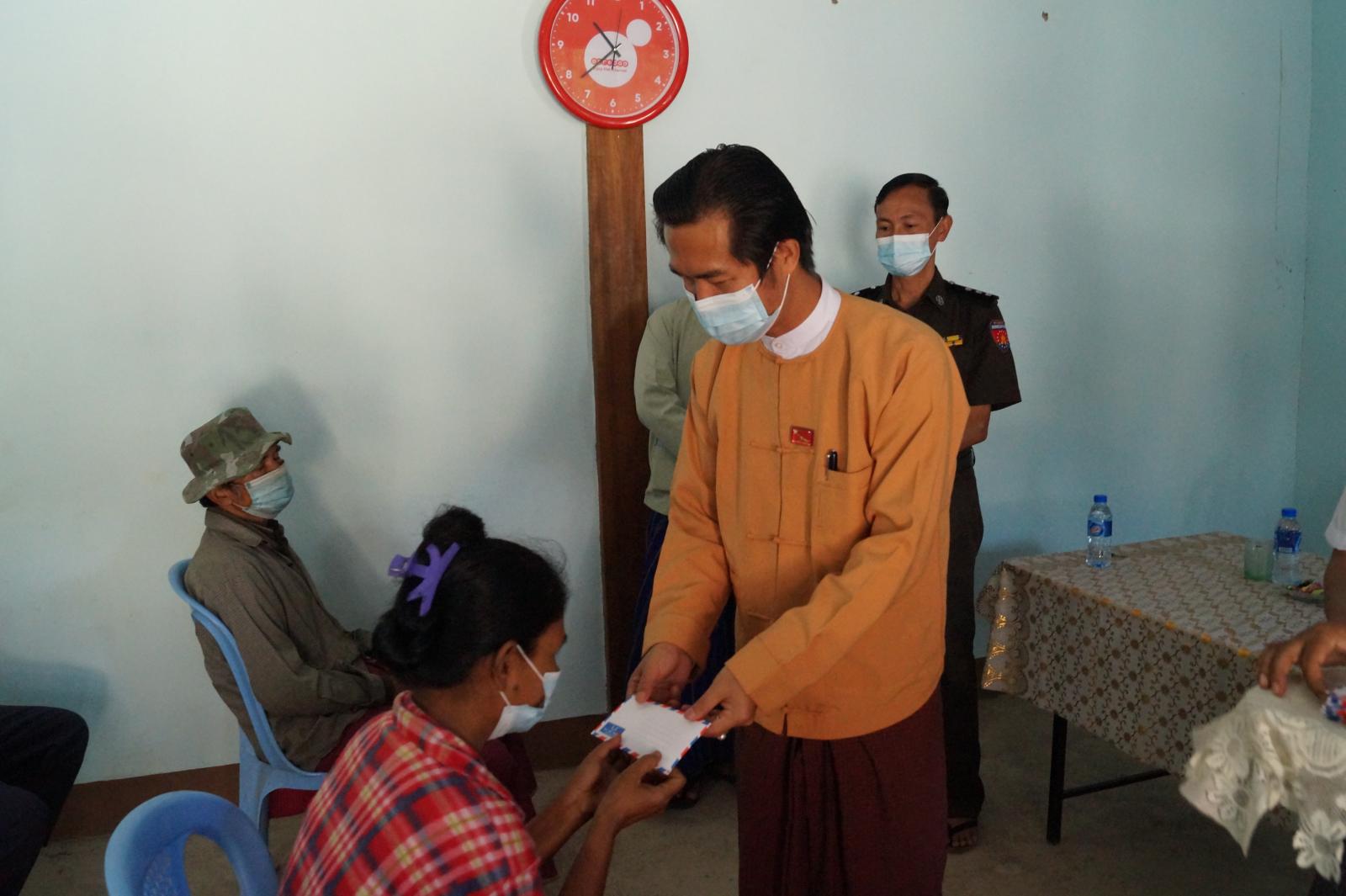 ထို့နောက် ပြည်နယ်လွှတ်တော်ကိုယ်စားလှယ် ဦးအယ်လ်ဖောင်းရှို၊ မြို့နယ်အုပ်ချုပ်ရေးမှူး ဦးလှမျိုးထွန်းနှင့် ဌာနဆိုင်ရာတာဝန်ရှိသူများက တောင်ပိုင်းရပ်ကွက်ရှိ အိမ်ထောင်စု (၁၈)စု၊ မြောက်ပိုင်းရပ်ကွက်ရှိ အိမ်ထောင်စု (၂၀)စု တို့အတွက် အိမ်ထောင်စုတစ်စုလျှင် ငွေကျပ် ၂၀၀၀၀ နှုန်းဖြင့် စုစုပေါင်း ငွေကျပ် ၇၆၀,၀၀၀ ကို လက်ဝယ်အရောက် ထောက်ပံ့ပေးအပ်ခဲ့သည်။