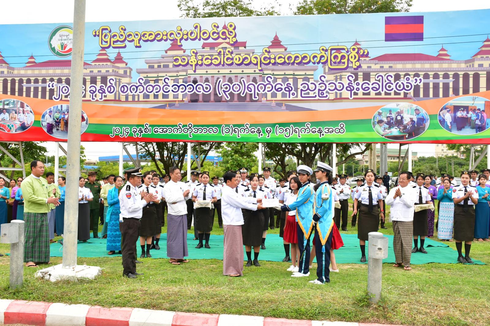 ထို့နောက် နေပြည်တော်သန်းခေါင်စာရင်းကြီးကြပ်မှုကော်မတီဥက္ကဋ္ဌ၊ နေပြည်တော်ကောင်စီဥက္ကဋ္ဌဦးသန်းထွန်းဦးက ဇမ္ဗူသီရိမြို့နယ်၊ အမှတ်(၆)အခြေခံပညာအထက်တန်းကျောင်းမှ ဘင်ခရာအဖွဲ့ ကျောင်းသား/ကျောင်းသူများအား ဂုဏ်ပြုဆုငွေများ ပေးအပ်ချီးမြှင့်သည်။