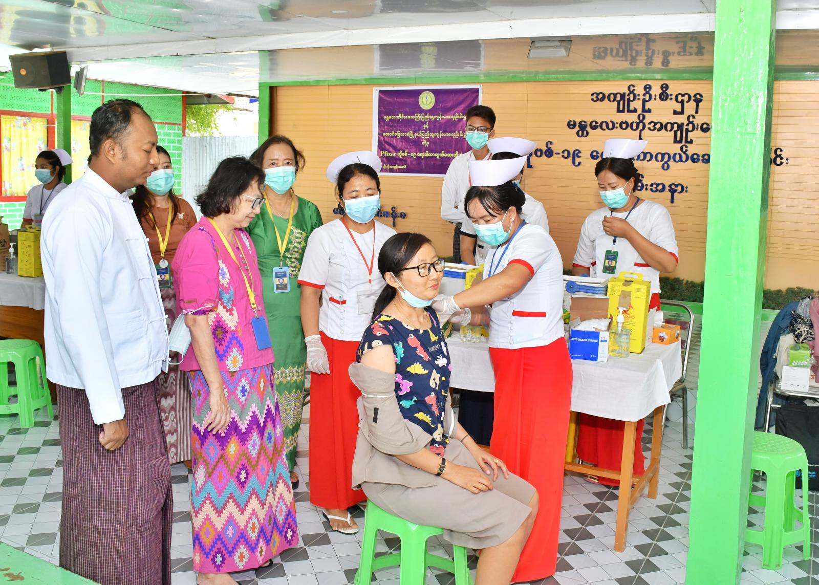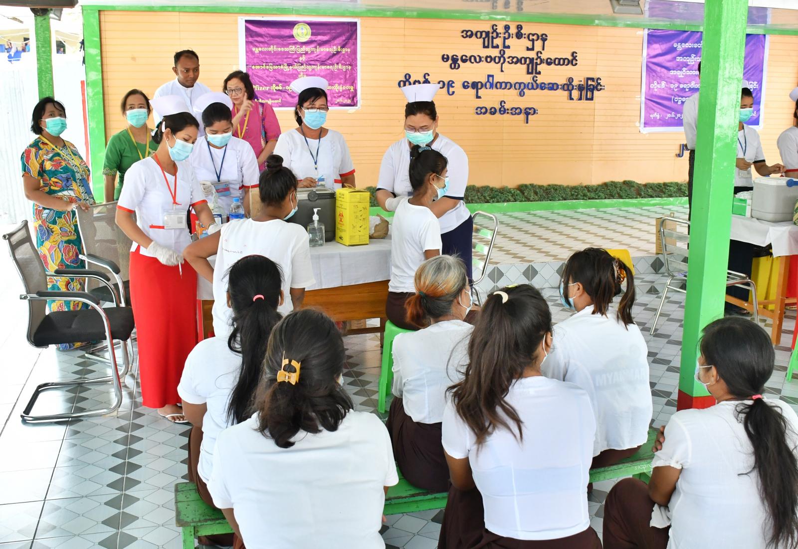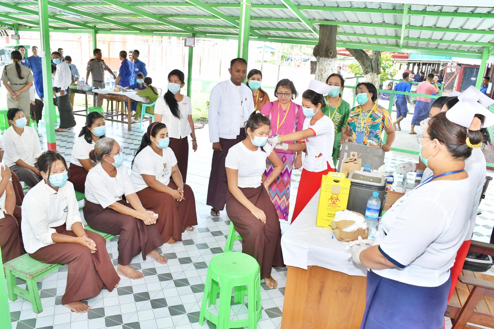 အကျဉ်ဦးစီးဌာန၊ မန္တလေးဗဟိုအကျဉ်းထောင်မှ အကျဉ်းသူ/အကျဉ်းသားများနှင့် အကျဉ်းဦးစီးဌာန၊ ၀န်ထမ်းများအား ကိုဗစ်-၁၉ ရောဂါ ကာကွယ်ဆေး ထပ်ဆောင်းထိုးနှံပေးခြင်းကို ယမန်နေ့ နံနက်ပိုင်းမှ စတင်၍ မန္တလေး၊ အောင်မြေသာစံမြို့နယ်၊ အိုးဘို(ရွှေကျင်)ရပ်ကွက်ရှိ အဆိုပါအကျဉ်းထောင်တွင် ပြုလုပ်ကြသည်။