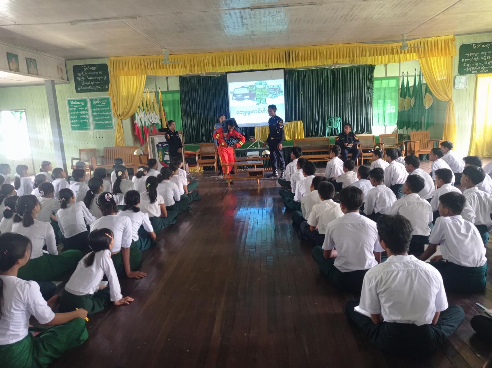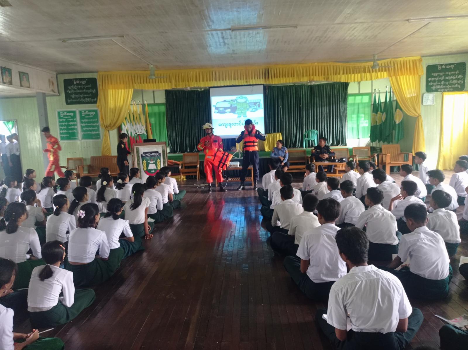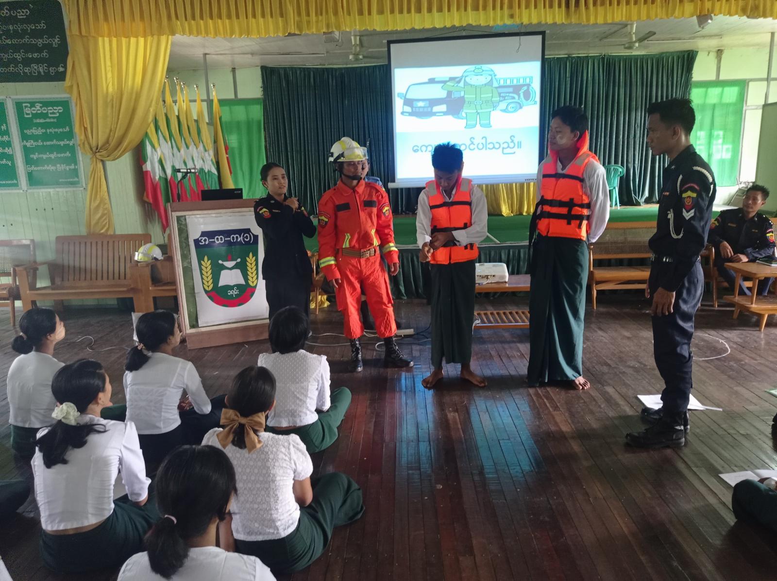 ထို့နောက်တပ်ဖွဲ့ဝင်များက သဘာဝဘေးအန္တရာယ် ကြိုတင်ကာကွယ်ရေး ဆောင်ရွက်သင့်သည်များကိုရှင်းလင်း၍၊ အရေးပေါ်အသက်ကယ်နိုင်သည့်အသက်ကယ် အင်္ကျီဝတ်ဆင်နည်း၊ အိမ်သုံးစွန့်ပြစ်ပစ္စည်းများဖြင့် အသက်ကယ်အင်္ကျီ ဆောင်ရွတ်ပုံတို့ကို လက်တွေ့သရုပ်ပြသခဲ့ကြောင်း သိရသည်။