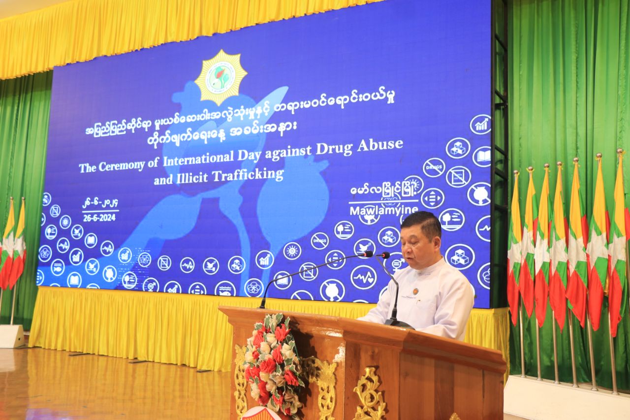 ၂၀၂၄ ခုနှစ်၊ ဇွန်လ ၂၆ ရက်နေ့တွင် ကျရောက်သည့် (၃၇)ကြိမ်မြောက် အပြည်ပြည်ဆိုင်ရာ မူးယစ်ဆေးဝါး အလွဲသုံးမှုနှင့် တရားမဝင်ရောင်းဝယ်မှုတိုက်ဖျက်ရေးနေ့ အခမ်းအနားကို ယမန်နေ့နံနက်ပိုင်းက မော်လမြိုင်မြို့ ပြည်နယ်ခန်းမ၌ ကျင်းပပြုလုပ်ရာ ပြည်နယ်ဝန်ကြီးချုပ် ဦးအောင်ကြည်သိန်း၊ ပြည်နယ်တရားလွှတ်တော်တရားသူကြီးချုပ်၊ အရှေ့တောင်တိုင်းစစ်ဌာနချုပ် တိုင်းဦးစီးချုပ်၊ ပြည်နယ်အစိုးရအဖွဲ့ဝင်ဝန်ကြီးများ၊ ဌာနဆိုင်ရာတာဝန်ရှိသူများ၊ ကျောင်းသား၊ ကျောင်းသူများ၊ ဖိတ်ကြားထားသော ဧည့်သည်တော်များ တက်ရောက်ခဲ့သည်။