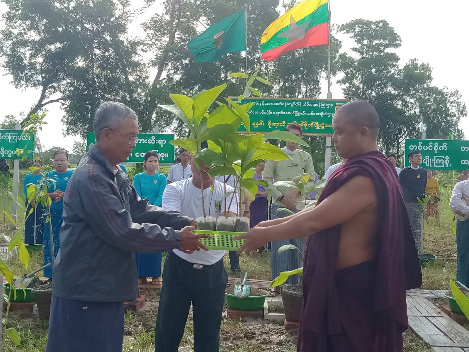 အခမ်းအနားတွင် ညောင်လေးပင်ခရိုင်၊ ခရိုင်စီမံအုပ်ချုပ်ရေးအဖွဲ့ဥက္ကဌ ဦးအောင်ကျော်စိုး၊ သစ်တောဦးစီးဌာနမှ ဦးစီးအရာရှိ ဦးတင်လင်းအောင် နှင့် ခရိုင်စီမံအုပ်ချုပ်ရေးအဖွဲ့ အဖွဲ့ဝင် (၂) ဦးလှမြင့်တို့မှ သဘာဝပတ်ဝန်းကျင် စိမ်းလမ်းစိုပြည်စေရေးအတွက် သစ်တောပျိုးပင်များအားလည်းကောင်း၊ ကမ္ဘာ့အပူချိန် လျော့ချရေးလုပ်ငန်း အထောက်အကူပြု သစ်တောပျိုးပင်များအားလည်းကောင်း၊ ကမ္ဘာ့သဲကန္တာရများ ဖြစ်ထွန်းမှု တိုက်ဖျက်ရေးအထောက်အကူပြု သစ်တောပျိုးပင်များအားလည်းကောင်း ခရိုင်အမျိုးသမီးရေးရာအဖွဲ့နှင့် ကြားတောရဘုန်းတော်ကြီးကျောင်းတိုက်ဆရာတော်တို့အား အသီးသီးပေးအပ်ခဲ့ကြသည်။