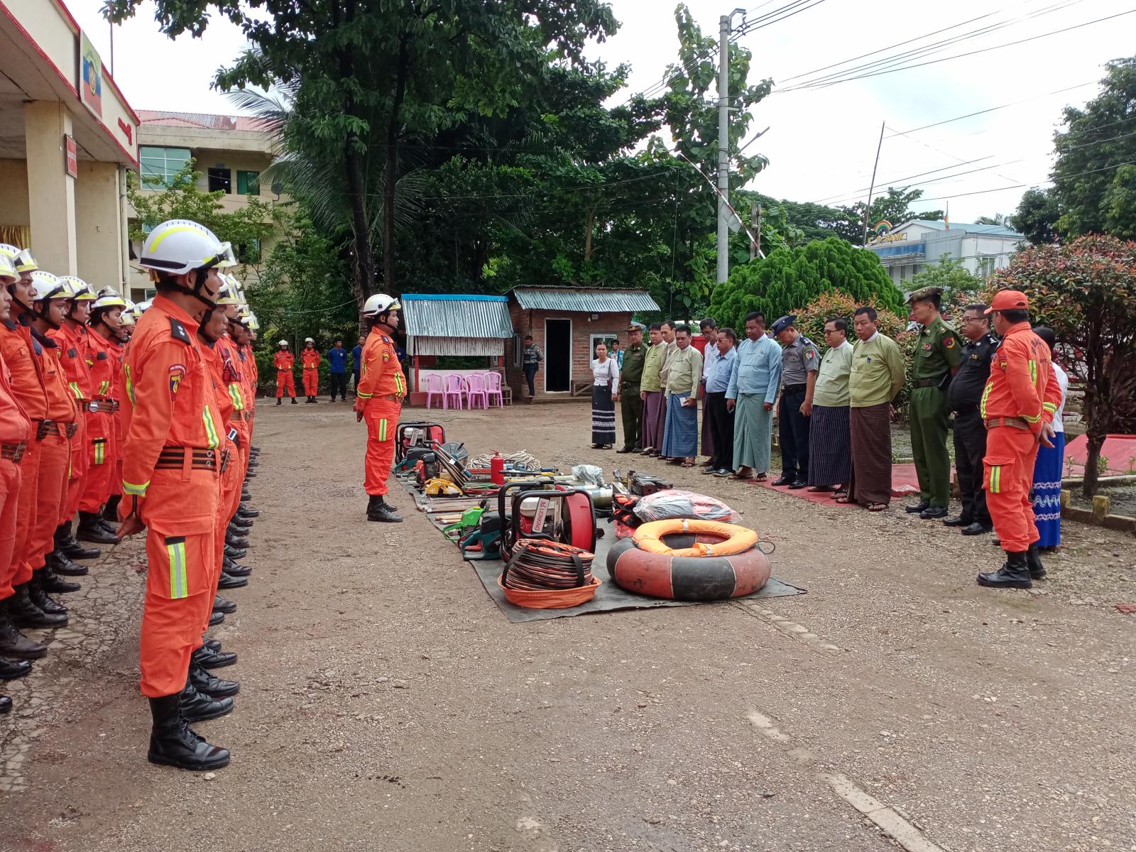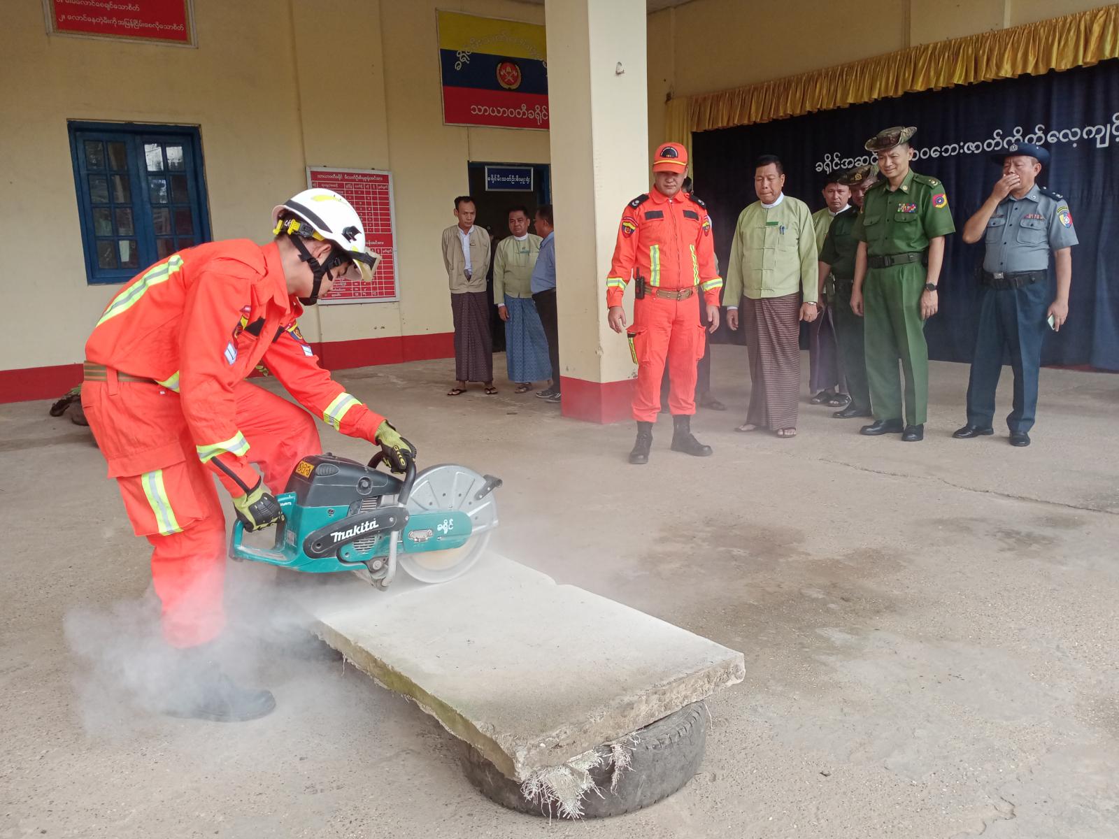 ဦးစွာ ခရိုင်စီမံအုပ်ချုပ်ရေးအဖွဲ့ဥက္ကဋ္ဌ ဦးစန်းဝင်းက အဖွင့်အမှာစကားပြောကြားပြီး ခရိုင်မီးသတ်ဦးစီးမှူး လက်ထောက်ညွှန်ကြားရေးမှူး ဦးမင်းသိမ်းထွန်းက သဘာဝဘေးအန္တရာယ်ဆိုင်ရာ ဇာတ်တိုက်လေ့ကျင့်ခြင်းနှင့်ပတ်သက်၍ ရှင်းလင်းတင်ပြခြင်း၊ ရှာဖွေကယ်ဆယ်ရေး လုပ်ငန်းသုံးပစ္စည်းများအား ရှင်းလင်းတင်ပြခြင်း၊ ရှာဖွေကယ်ဆယ်ရေမီးသတ်တပ်ဖွဲ့ဝင် (၃၅)ဦးက ဇာတ်တိုက်လေ့ကျင့်ခြင်းများ ဆောင်ရွက်ခဲ့ကြသည်။