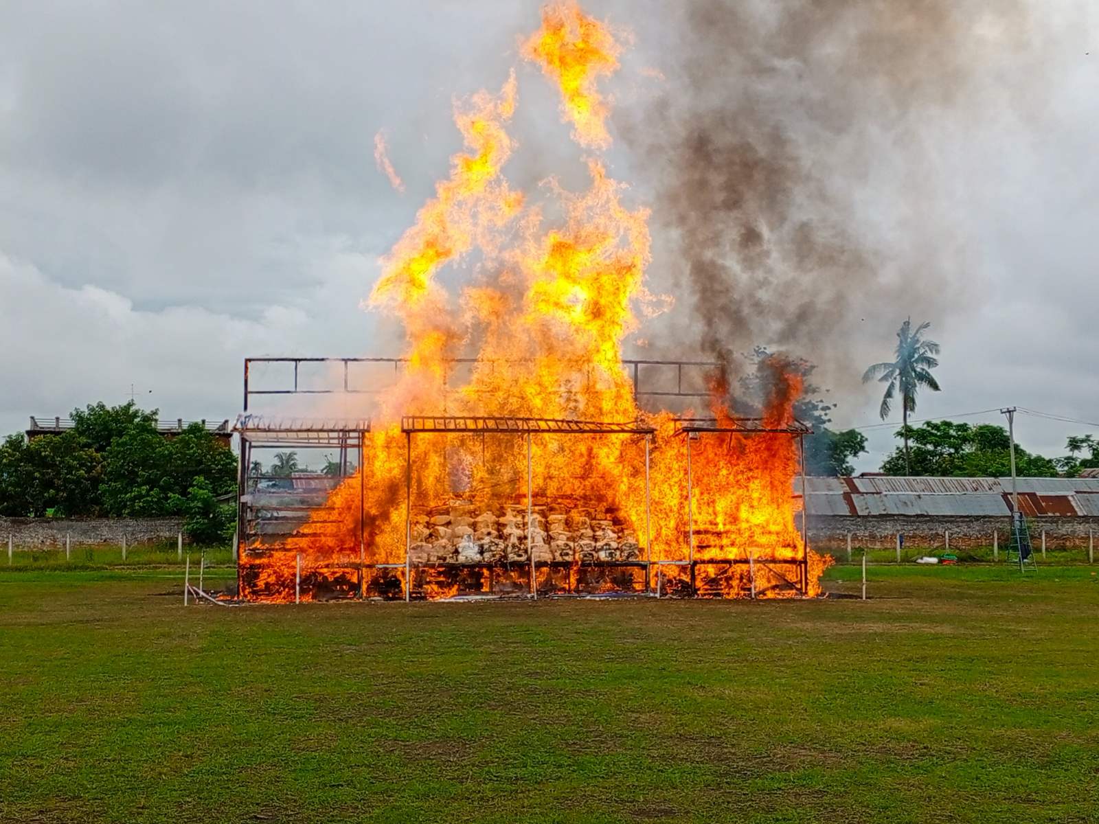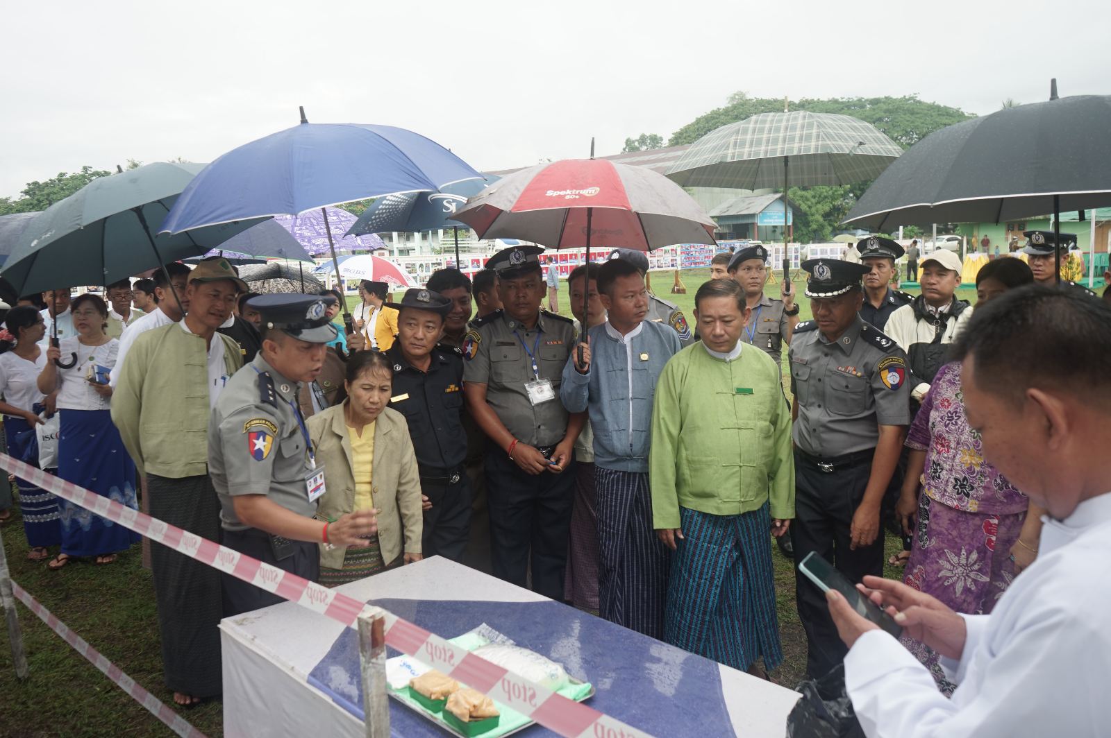ထို့နောက် ဝန်ကြီးချုပ်နှင့် တာဝန်ရှိသူများ၊ ဌာနဆိုင်ရာတာဝန်ရှိသူများ၊ ဆရာ၊ ဆရာမများ၊ ကျောင်းသား၊ ကျောင်းသူများသည် ခင်းကျင်းပြသထားသည့် မူးယစ်ဆေးဝါးနှင့်ပတ်သက်သည့် အသိပညာပေးဓာတ်ပုံများ၊ ဆေးဝါးများ၊ ဆုရ ကျောင်းသား၊ ကျောင်းသူများရေးဆွဲထားသည့် ပန်းချီ၊ ကာတွန်း၊ ပိုစတာများ မူးယစ်ဆေးဝါးနှင့်စိတ်ကို ပြောင်းလဲစေသော ဆေးဝါးများအန္တရာယ် တားဆီးကာကွယ်ရေးအဖွဲ့မှ ဖမ်းဆီးရမိသော ဆေးဝါးများကို လှည့်လည်ကြည့်ရှုကြသည်။ ဆက်လက်၍ ဝန်ကြီးချုပ်နှင့် တာဝန်ရှိသူများသည် ဖမ်းဆီးရမိသော ဘိန်းဖြူ (၆၄.၃၀၁၁၃) ကီလိုကျော်၊ စိတ်ကြွရူးသွပ်ဆေးပြား အရေအတွက် (၁၄) သိန်းကျော်၊ ကဖင်း (၃၂၀၀)ကီလို၊ အိုက်စ်(၂၄)ကီလိုရှိသော ဆေးဝါးများကို စက်ခလုပ်နှိပ်၍ မီးရှို့ဖျက်ဆီးပေးခဲ့ကြောင်း သိရသည်။