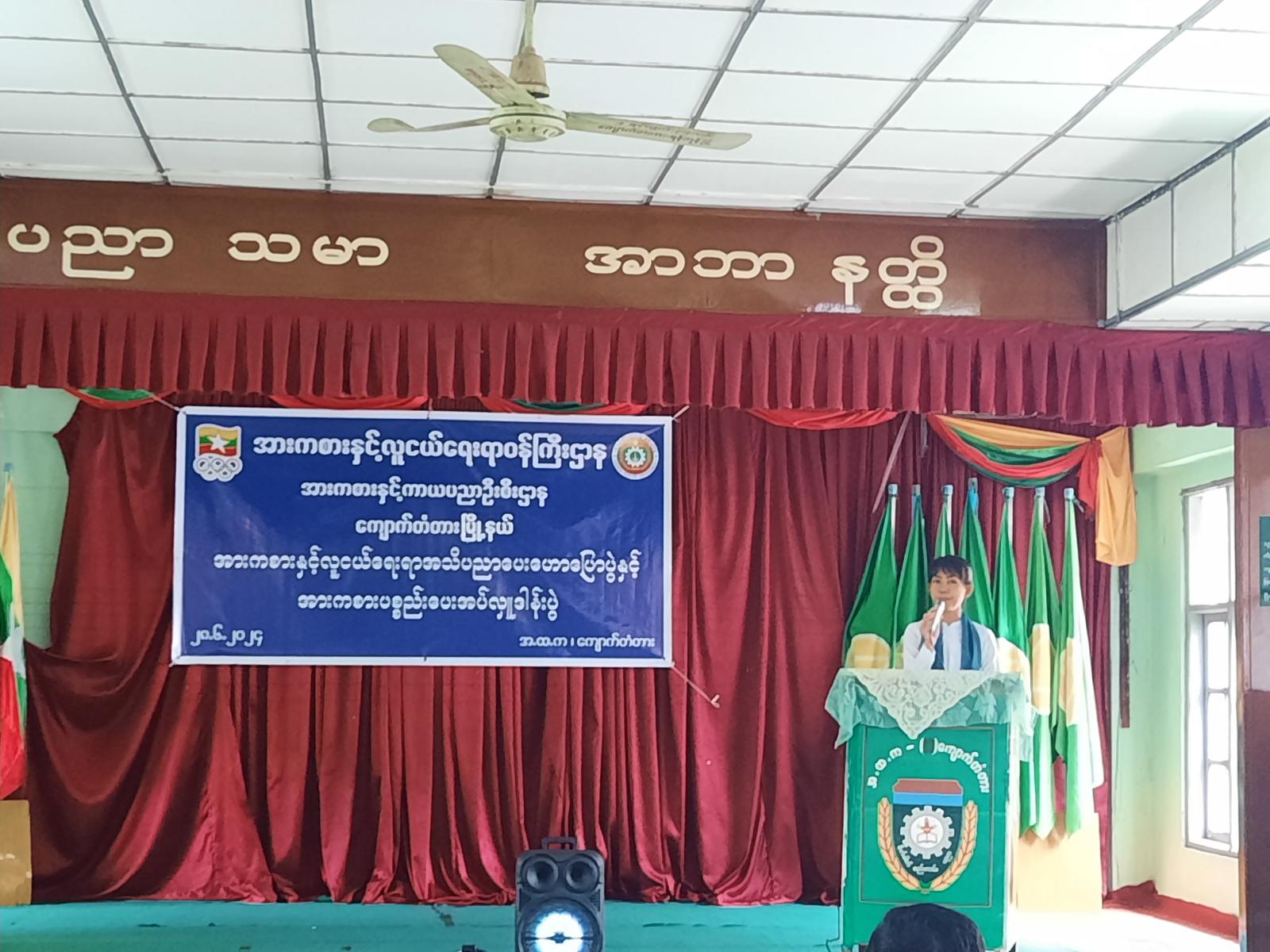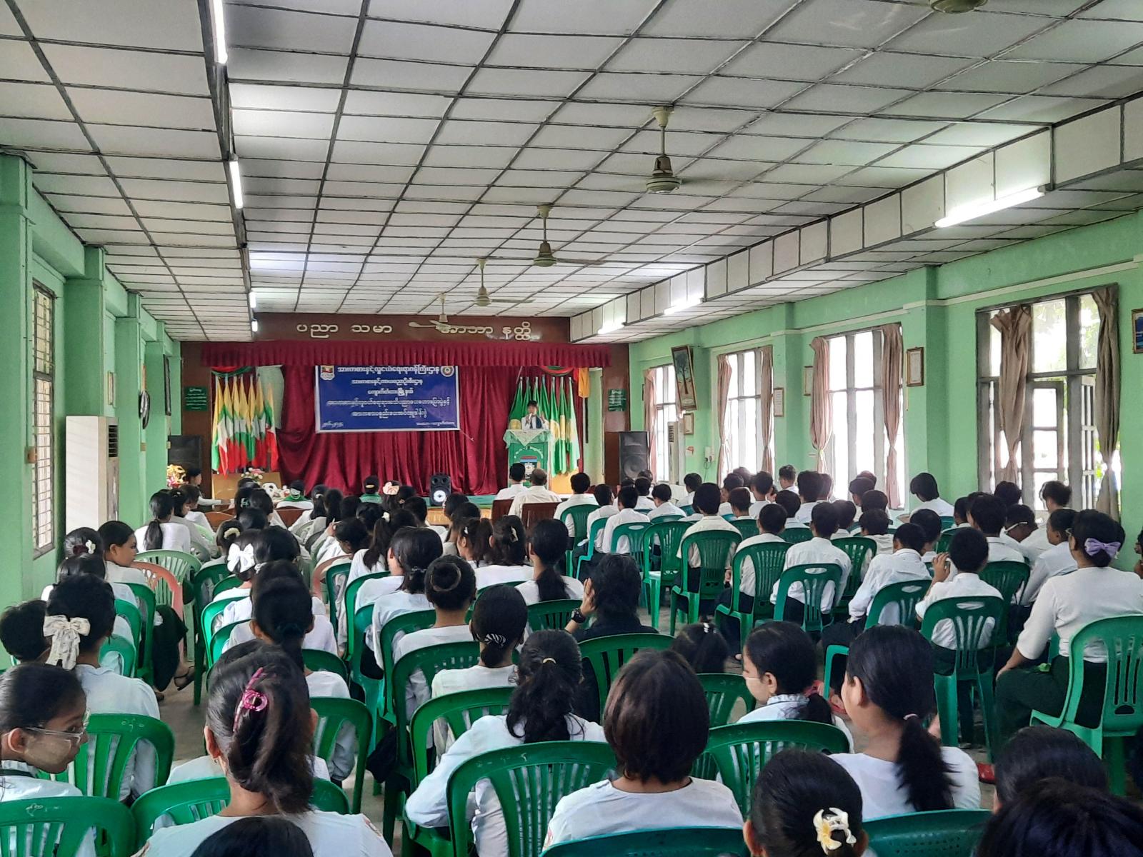 ရှေးဦးစွာ မြို့နယ်ပညာရေးမှူးဒေါ်လှလှဝင်းက အဖွင့်အမှာစကားပြောကြားခဲ့ပြီး မြို့နယ်ပြန်ကြားရေးနှင့်ပြည်သူ့ဆက်ဆံရေးဦးစီးဌာနမှ မြို့နယ်ဦးစီးမှူးက လူငယ်နှင့်မူးယစ်အန္တရာယ်အကြောင်း ဟောပြောဆွေးနွေးခဲ့သည်။ ဆက်လက်၍ မြို့နယ်အားကစားနှင့်ကာယပညာဦးစီးဌာနမှတာဝန်ခံက အခြေခံပညာအထက်တန်းကျောင်းအတွက် အားကစားပစ္စည်းများကိုလှူဒါန်းပေးခဲ့ရာ ကျောင်းအုပ်ဆရာမကြီးဒေါ်တင့်စန်းက လက်ခံရယူခဲ့သည်။