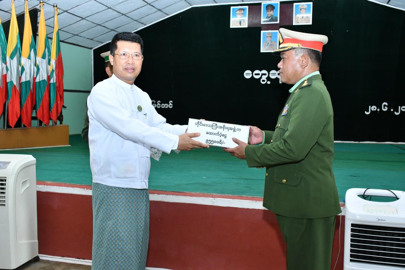 ဆက်လက်၍ နယ်မြေခံလေ့ကျင့်ရေးကျောင်း ဘုရင့်နောင်ခန်းမတွင် ပြည်သူ့စစ်မှုထမ်းသင်တန်းအမှတ်စဉ်(၁/၂၀၂၄) သင်တန်းဆင်း သင်တန်းသားများနှင့်တွေ့ဆုံ၍ တိုင်းဒေသကြီးဝန်ကြီးချုပ်က“တိုင်းဒေသကြီးအတွင်း ပြည်သူ့စစ်မှုထမ်းဆောင်ရန်ဆန္ဒပြုပြီး သတ်မှတ်ချက်များနှင့်ကိုက်ညီသည့်သူများဖြင့် ပြည်သူ့စစ်မှုထမ်းသင်တန်းအမှတ်စဉ်(၁)ကို စတင်ဖွင့်လှစ်ပြီး ယနေ့တွင် အောင်မြင်စွာသင်တန်းဆင်းနိုင်ခဲ့ပြီဖြစ်၍ နိုင်ငံတော်နှင့်တပ်မတော်အတွက်ဂုဏ်ယူရမည့်နေ့ဖြစ်ပါကြောင်း၊ နိုင်ငံသားတိုင်းသည် ဒို့တာဝန်အရေးသုံးပါးကို စောင့်ထိန်းရန်တာဝန်ရှိပါကြောင်း၊ တိုင်းဒေသကြီးအတွင်း မှီတင်းနေထိုင်ကြသည့် တိုင်းရင်းသားပြည်သူများမှ မွေးဖွားလာသည့် သားကောင်းရတနာများသည် စစ်ပညာများကိုအခြေခံမှစ၍ တတ်မြောက်အောင် သင်ကြားဆည်းပူးနိုင်ခဲ့ပြီးဖြစ်ပါကြောင်း၊ ဒို့တာဝန်အရေးသုံးပါးကို စောင့်ထိန်းရန်တာဝန်ရှိသည့် နိုင်ငံသားတစ်ယောက်အနေဖြင့် စစ်ပညာသင်ကြားပြီး နိုင်ငံတော်ကာကွယ်ရေးအတွက်ရည်ရွယ်ကာ ဆောင်ရွက်ခြင်းဖြစ်၍ မိမိအနေဖြင့် များစွာဂုဏ်ယူပါကြောင်း၊ တပ်မတော်သားတစ်ယောက်အနေဖြင့် လိုက်နာစောင့်ထိန်းရမည့်ကျင့်ဝတ်၊ စည်းကမ်းများကို အလေးထားလိုက်နာရမည်ဖြစ်ပါကြောင်း၊ မိမိတို့တာဝန်ကျရာဒေသများတွင် ပေးအပ်သည့်တာဝန်များကို ကျေပွန်စွာထမ်းဆောင်၍ စစ်သားကောင်း တစ်ယောက်ဖြစ်အောင် ကြိုးပမ်းဆောင်ရွက်သွားကြစေလိုကြောင်း” တိုက်တွန်းအားပေး စကားများ ပြောကြားခဲ့သည်။