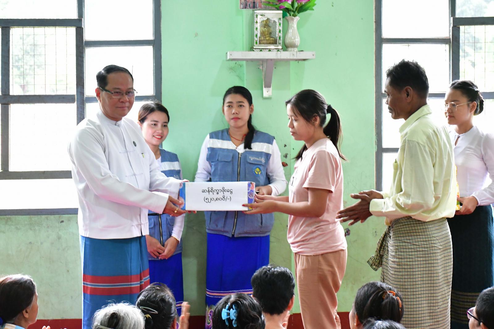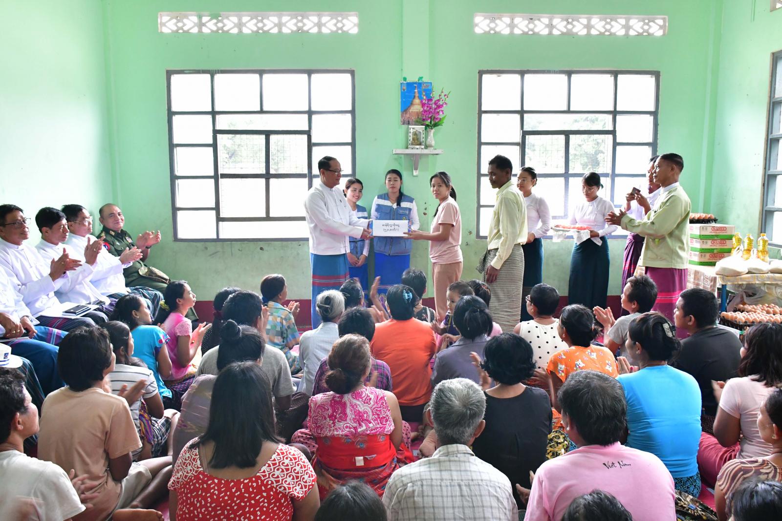 ထို့နောက် ပြည်နယ်ဝန်ကြီးချုပ်နှင့်တာဝန်ရှိသူများက အဆိုပါကယ်ဆယ်ရေးစခန်းရှိ အိမ်ထောင်စု ၅၅ စု၊ လူဦးရေ ၂၄၈ ဦးတို့အား ကရင်ပြည်နယ်အစိုးရအဖွဲ့မှထောက်ပံ့သော ဆန်၊ ဆီ၊ ကြက်ဥ၊ ခေါက်ဆွဲခြောက် အစရှိသော စားသောက်ကုန်ပစ္စည်းများနှင့် လူမှုဝန်ထမ်း၊ကယ်ဆယ်ရေးနှင့်ပြန်လည်နေရာချထားရေးဝန်ကြီးဌာန၊ ဘေးအန္တရာယ်ဆိုင်ရာစီမံခန့်ခွဲမှုဦးစီးဌာနမှ ထောက်ပံ့သော ဆန်ရိက္ခာဖိုးငွေ ၅၂၀၈၀ဝိ/-(ငါးသိန်းနှစ်သောင်းရှစ်ရာ) ကျပ်တို့ကို ထောက်ပံ့ပေးအပ်သည်။
