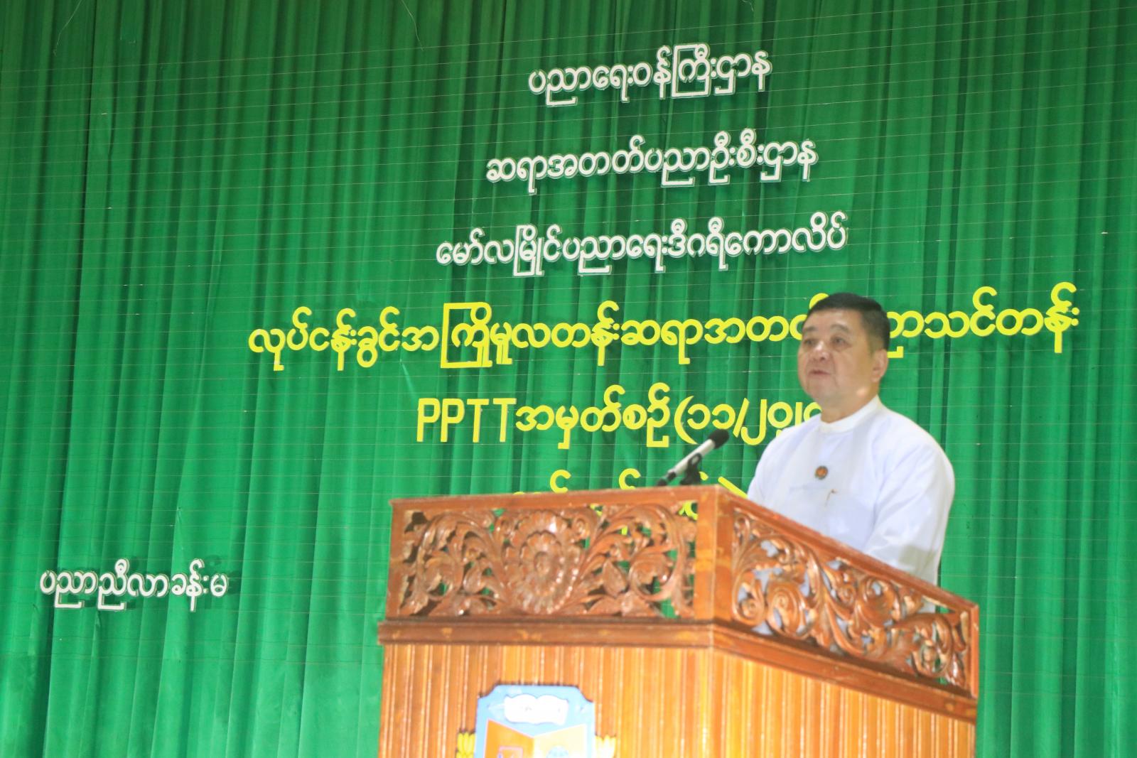 ရှေးဦးစွာ ကျောင်းသား၊ ကျောင်းသူများက “ကျရာဒေသတာဝန်ထမ်းစို့" သီချင်းဖြင့် သီဆိုဖျော်ဖြေပြီး မွန်ပြည်နယ်ဝန်ကြီးချုပ်ဉီးအောင်ကြည်သိန်းက လုပ်ငန်းခွင်အကြိုမူလတန်း ဆရာအတတ်ပညာသင်တန်းကို မောင်မယ်တို့ ကောင်းမွန်အောင်မြင်စွာ တက်ရောက်ပြီးစီးတဲ့အတွက် လွန်စွာဝမ်းမြောက်ဂုဏ်ယူပါကြောင်း၊ နိုင်ငံတစ်နိုင်ငံဘက်စုံဖွံ့ဖြိုးတိုးတက်မှုအတွက် ပညာရေးသည် အခြေခံအကျဆုံး အရေးအကြီးဆုံးဖြစ်ပါကြောင်း၊ “ယနေ့လူငယ်နောင်ဝယ်လူကြီး”ဆိုတဲ့ ဆိုရိုးစကားအတိုင်း အရည်အချင်း ပြည့်ဝသည့်လူငယ်များစွာကို မွေးထုတ်ပေးနိုင်ပါမှ နောင်အနာဂတ် နိုင်ငံတော်ကြီး ပိုမိုစည်ပင်ဖွံ့ဖြိုးတိုးတက်မှာ ဧကန်ဖြစ်ပါကြောင်း၊ မောင်တို့မယ်တို့ဟာ အမိကျောင်းတော်ကြီးက သင်ကြားပေးလိုက်သည့် ဆရာအတတ်ပညာကို စာတွေ့နှင့် သရုပ်ပြသင်ကြားပြသခြင်းကို ကောင်းစွာခံယူပြီးသော်လည်း လုပ်ငန်းခွင်မဝင်ခင် မိမိရပ်ရွာမှ လက်တွေ့တန်းပြ သင်တန်းဆင်းရဦးမယ်လို့ သိရပါကြောင်း၊ စာတွေ့လက်တွေ့ပေါင်းစပ်ပြီး အခြေခံပညာကဏ္ဍအတွက် လိုအပ်နေသည့် ဆရာအရည်အသွေး ပြည့်ဝသော ဆရာတစ်ယောက်အဖြစ် နိုင်ငံ့တာဝန် ကျေပွန်စေချင်ပါကြောင်း၊ လူတိုင်းအခြေခံပညာကို သင်ယူခွင့်ရရှိအောင် ဆောင်ရွက်ရာမှာ အဓိကကျသည့်တာဝန်ကို ထမ်းဆောင်ရမဲ့ ဘွဲ့ရလုပ်ငန်းခွင် အကြိုမူလတန်း ဆရာအတတ်ပညာ သင်တန်းသား၊ သင်တန်းသူများကို အရည်အချင်းရှိသည့် ဆရာ၊ ဆရာမတွေဖြစ်အောင် ကြိုးစားကြဖို့ နိုင်ငံတကာနှင့် ရင်ဘောင်တန်းနိုင်မည့် ၂၁ ရာစုကျွမ်းကျင်မှုများကို သင်ကြားပို့ချပေးနိုင်သူ၊ ကလေးများအပေါ်မှာ မှန်ကန်သည့် စိတ်ထားနှင့် သင်ကြားပြသတတ်သူ၊ ဆရာကောင်း၊ ဆရာမွန်များအဖြစ် အမိနိုင်ငံတော်ကြီး၏ ပညာရောင်ခြည်ထွန်းတောက်လာအောင် အင်တိုက်အားတိုက် ဝိုင်းဝန်းကြိုးပမ်းဆောင်ရွက်ကြမယ်လို့ ယုံကြည်မျှော်လင့်ပါကြောင်း တိုက်တွန်းပြောကြားသည်။