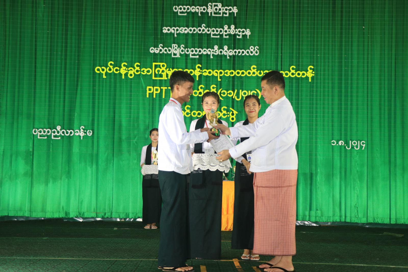 ထို့နောက် မော်လမြိုင်ပညာရေးဒီဂရီကောလိပ် ကျောင်းအုပ်ကြီးဒေါ်မိညိုညိုရှိန်က သင်တန်းဆင်းအမှာစကားပြောကြားပြီး ဆုရသင်တန်းသား၊ သင်တန်းသူများအား မွန်ပြည်နယ်၀န်ကြီးချုပ်၊ ပြည်နယ်တရားလွှတ်တော်တရားသူကြီးချုပ်နှင့် ပြည်နယ်အစိုးရအဖွဲ့ဝင်ဝန်ကြီးများက ဆုများအသီးသီး ပေးအပ်ချီးမြှင့်ခဲ့သည်။