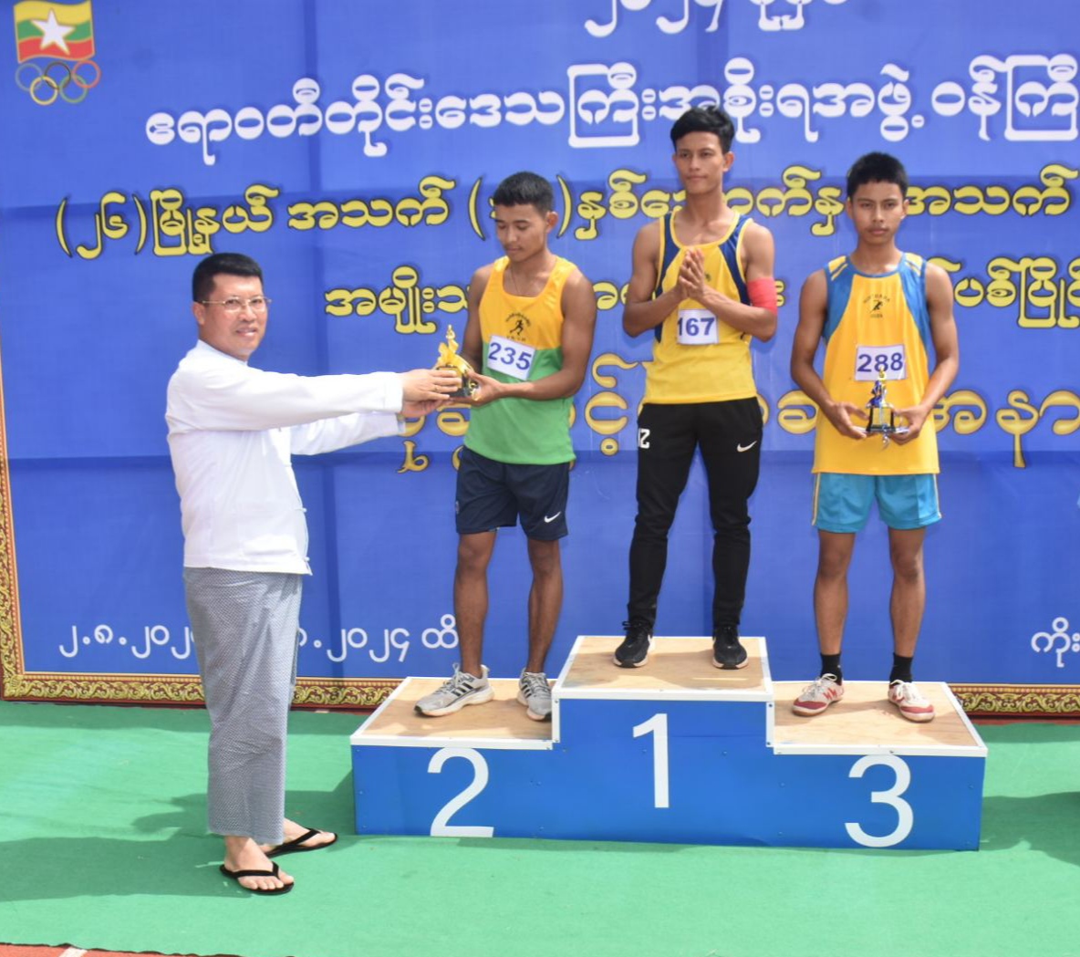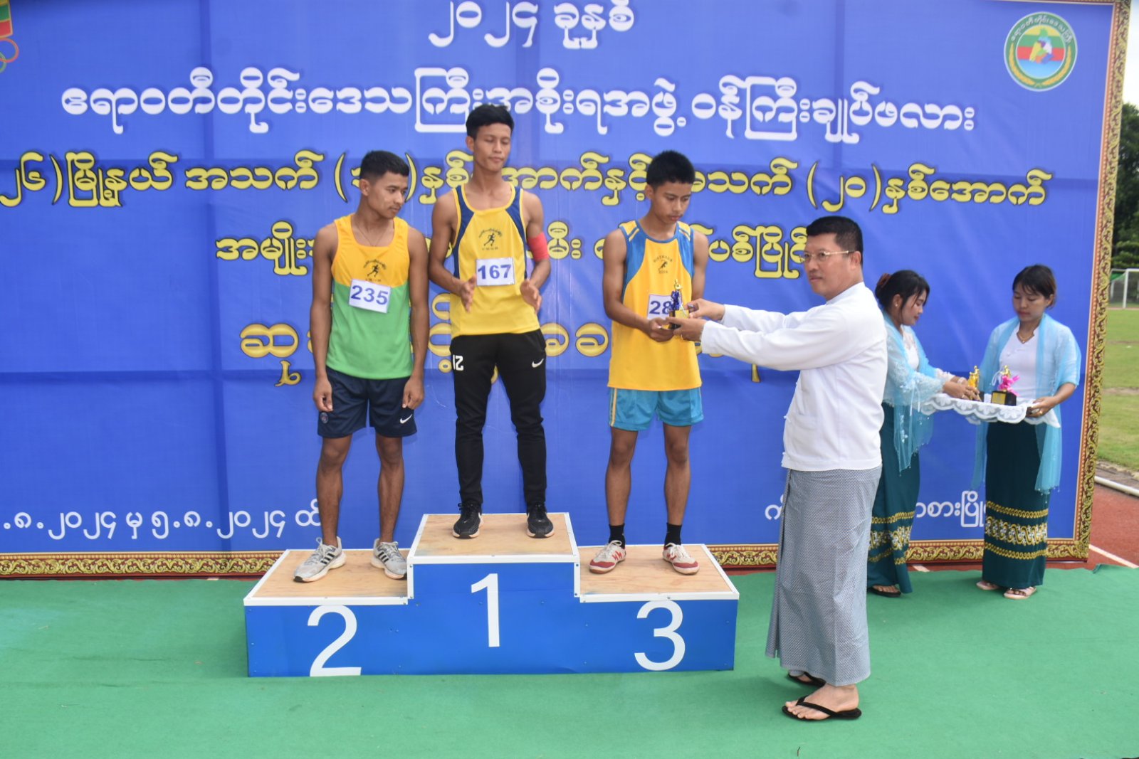 ထို့နောက် စစ်ကြောင်းမှူးဦးဆောင်သည့် ပြိုင်ပွဲဝင်အသင်းများက ဝန်ကြီးချုပ်အား အလေးပြုခြင်းနှင့် အားကစားသစ္စာအဓိဌာန် (၄) ချက်အား ရွတ်ဆိုခြင်းများကို ဆောင်ရွက်ခဲ့ကြကာ ကွင်းအတွင်းမှ ပြန်လည်ထွက်ခွာခဲ့ကြပြီးနောက် တိုင်းဒေသကြီးဝန်ကြီးချုပ်က အနောက်တောင်တိုင်းစစ်ဌာနချုပ် စစ်တီးဝိုင်းအဖွဲ့အား ဂုဏ်ပြုချီးမြှင့်ငွေများပေးအပ်ခဲ့ပြီး ပြိုင်ပွဲဝင်များ၏ ယှဉ်ပြိုင်နေမှုများကို ကြည့်ရှုအားပေးခဲ့သည်။ ယင်းနောက် ဆုချီးမြှင့်ပွဲအခမ်းအနားကို ဆက်လက်ပြုလုပ်ရာ အသက် (၁၈) နှစ်အောက် အမျိုးသမီး မီတာ (၁၅၀၀) ပြိုင်ပွဲတွင် ပထမ၊ ဒုတိယနှင့် တတိယဆုရရှိသူများအား တစ်ဦးချင်းဆုတံဆိပ်များနှင့် ငွေသားဆုများကို တိုင်းဒေသကြီးရဲတပ်ဖွဲ့မှူး၏ ဇနီးကလည်းကောင်း၊ အသက် (၁၈) နှစ်အောက် အမျိုးသမီး မီတာ (၁၀၀) ပြိုင်ပွဲတွင် ပထမ၊ ဒုတိယနှင့် တတိယဆုရရှိသူများအား တစ်ဦးချင်း ဆုတံဆိပ်များနှင့် ငွေသားဆုများကို တိုင်းဒေသကြီးအစိုးရအဖွဲ့ အတွင်းရေးမှူး၏ ဇနီးကလည်းကောင်း၊ အသက် (၂၀) နှစ်အောက် အမျိုးသမီး မီတာ (၁၀၀) ပြိုင်ပွဲတွင် ပထမ၊ ဒုတိယနှင့် တတိယဆုရရှိသူများအား တစ်ဦးချင်းဆုတံဆိပ်များနှင့် ငွေသားဆုများကို တိုင်းဒေသကြီး ဥပဒေချုပ်ကလည်းကောင်း၊ အသက် (၁၈) နှစ်အောက် အမျိုးသား မီတာ (၁၅၀၀) ပြိုင်ပွဲတွင် ပထမ၊ ဒုတိယနှင့် တတိယဆုရရှိသူများအား တစ်ဦးချင်းဆုတံဆိပ်များနှင့် ငွေသားဆုများကို အရှေ့တောင်အာရှအားကစားပြိုင်ပွဲ (ဘော်လီဘောပြိုင်ပွဲ) တွင် ရွှေတံဆိပ်သုံးဆုရှင် မြန်မာ့လက်ရွေးစင်ဟောင်း ဦးတင်ဦးကလည်းကောင်း၊ အသက် (၁၈) နှစ်အောက် အမျိုးသား မီတာ (၁၀၀) ပြိုင်ပွဲတွင် ပထမ၊ ဒုတိယနှင့် တတိယဆုရရှိသူများအား တစ်ဦးချင်းဆုတံဆိပ်များနှင့် ငွေသားဆုများကို တိုင်းရင်းသားရေးရာဝန်ကြီးကလည်းကောင်း၊ အသက် (၂၀) နှစ်အောက် အမျိုးသား မီတာ (၁၀၀) ပြိုင်ပွဲတွင် ပထမ၊ ဒုတိယနှင့် တတိယဆုရရှိသူများအား တစ်ဦးချင်း ဆုတံဆိပ်များနှင့် ငွေသားဆုများကို လုံခြုံရေးနှင့်နယ်စပ်ရေးရာ ဝန်ကြီးကလည်းကောင်း၊ အသက် (၁၈) နှစ်အောက် အမျိုးသမီး မီတာ (၄၀၀) ပြိုင်ပွဲနှင့် အသက် (၂၀) နှစ်အောက် အမျိုးသမီး မီတာ (၄၀၀) ပြိုင်ပွဲတွင် ပထမ၊ ဒုတိယနှင့် တတိယ ဆုရရှိသူများအား တစ်ဦးချင်းဆုတံဆိပ်များနှင့် ငွေသားဆုများကို တိုင်းဒေသကြီးဝန်ကြီးချုပ်၏ ဇနီးကလည်းကောင်း၊ အသက် (၁၈) နှစ်အောက် အမျိုးသား မီတာ (၄၀၀) ပြိုင်ပွဲနှင့် အသက် (၂၀) နှစ်အောက် အမျိုးသားမီတာ (၄၀၀) ပြိုင်ပွဲတွင် ပထမ၊ ဒုတိယနှင့် တတိယဆုရရှိသူများအား တစ်ဦးချင်းဆုတံဆိပ်များနှင့် ငွေသားဆုများကို တိုင်းဒေသကြီး ဝန်ကြီးချုပ်ကလည်းကောင်း အသီးသီးချီးမြှင့်ခဲ့ကြသည်။