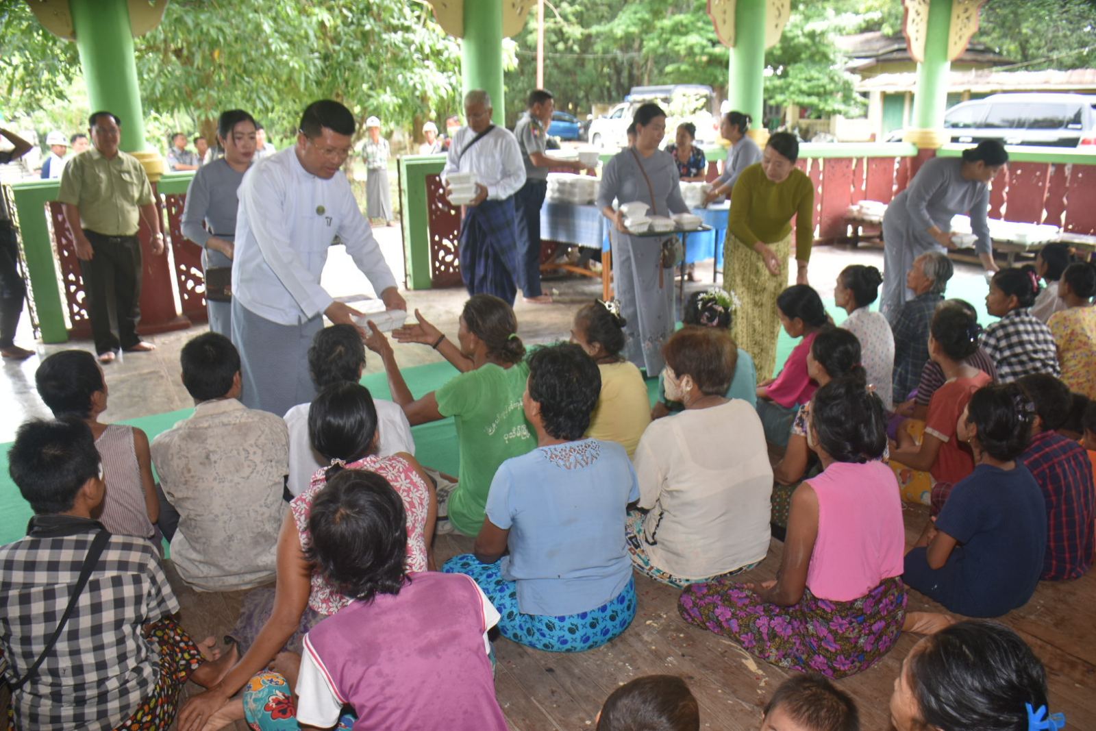 ဆက်လက်၍ တိုင်းဒေသကြီးဝန်ကြီးချုပ်နှင့် ဇနီးတို့သည် ပုသိမ်မြို့၊ ရှေးဟောင်းသမိုင်းဝင် လေးကျွန်းရန်အောင် ဖောင်တော်ဦးစေတီတော်မြတ်ကြီး၏ ပရဝုဏ်အတွင်းရှိ ရေကြည်ဦးဓမ္မာရုံတွင် ငဝန်မြစ်ရေမြင့်တက်မှုကြောင့် ယာယီရေဘေးရှောင် အိမ်ထောင်စု (၄၅) စု၊ လူဦးရေ (၁၇၁) ဦးတို့အားတွေ့ဆုံ၍ အားပေးစကားများ ပြောကြားခဲ့ပြီး နံနက်စာအာဟာရ စားသောက်ဖွယ်ရာများ ပေးအပ်ခဲ့ကြောင်း သိရသည်။