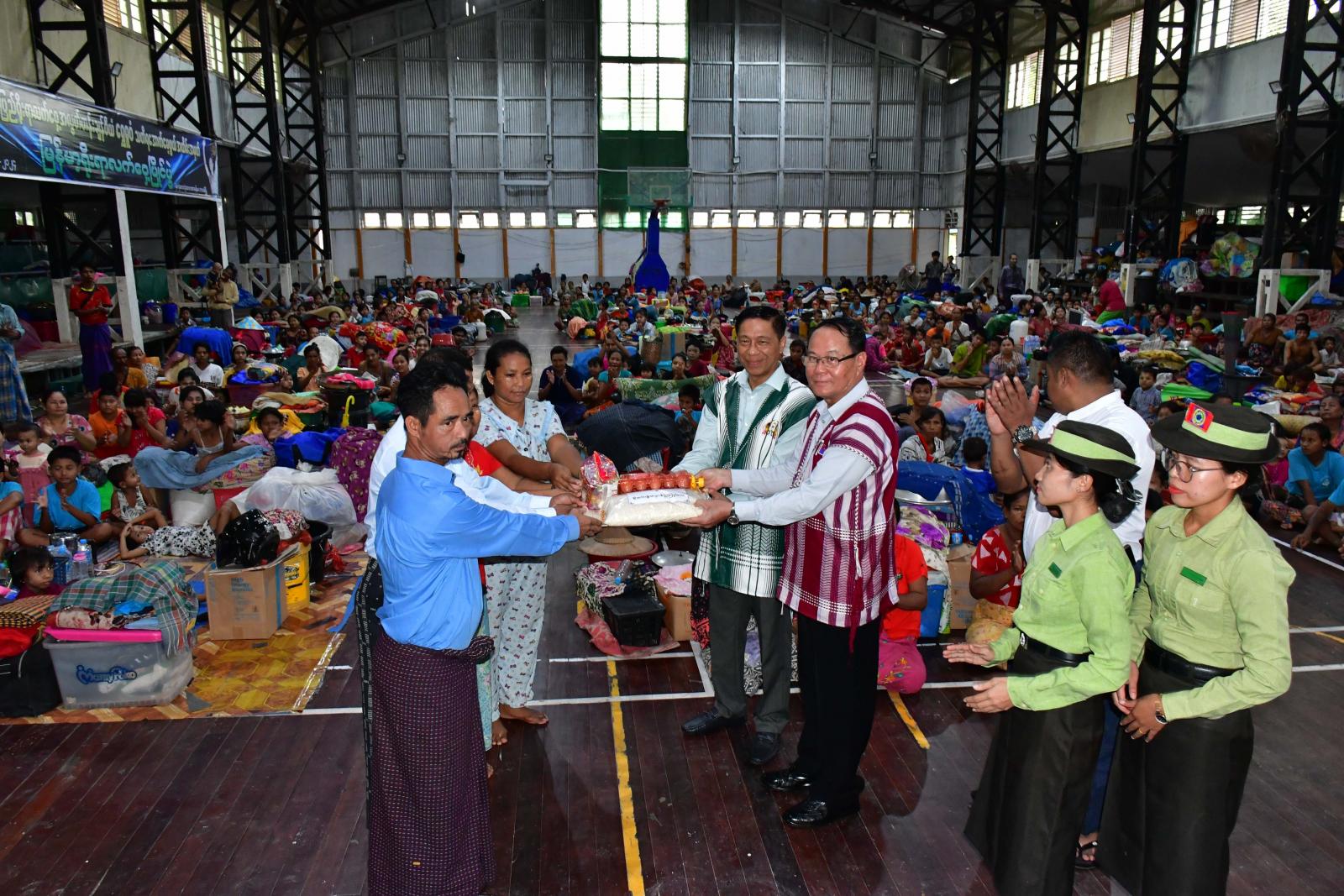 ထို့နောက် ပြည်ထောင်စုဝန်ကြီး၊ ပြည်နယ်ဝန်ကြီးချုပ်နှင့်တာဝန်ရှိသူများသည် နယ်မြေတည်ငြိမ်အေးချမ်းမှု အားနည်းသည့်အတွက် မြိုင်ကြီးငူအထူးဒေသသို့ ယာယီပြောင်းရွှေ့နေထိုင်သော နေရပ်စွန့်ခွာပြည်သူများအား စုံနံ့သာမြိုင်အခြေခံပညာအထက်တန်းကျောင်း(ခွဲ) စုံချစ်မြိုင်ခန်းမ၌ သွားရောက်တွေ့ဆုံရာ ပြည်ထောင်စုဝန်ကြီးက နိုင်ငံနှင့်ဒေသငြိမ်းချမ်းပါက ခံစားနေရသောလူမှု ဒုက္ခများမှ ကင်းဝေးကြရမည်ဖြစ်၍ မိမိတို့အသီးသီးငြိမ်းချမ်းရေးကို လက်ဆင့်ကမ်းနိုင်ရေး ကြိုးစား ကြရန်အားပေးစကားများပြောကြားပြီး ပြည်နယ်ဝန်ကြီးချုပ်က ယာယီနေထိုင်စဉ်ကာလအတွင်း စည်းစည်းလုံးလုံးနေထိုင်ကြစေလိုပြီး တစ်ကိုယ်ရည်သန့်ရှင်းရေး၊ ပတ်ဝန်းကျင်သန့်ရှင်းရေးနှင့် ကျန်းမာရေးကိုအထူးဂရုပြုကြရန်ပြောကြားကာ ယာယီနေရပ်စွန့်ခွာအိမ်ထောင်စု ၁၁၇၁ စု၊ လူဦးရေ ၆၁၆၃ ဦးအတွက် ဆန်ရိက္ခာဖိုး(၅၅,၄၆၇,၀၀ဝိ/-)နှင့် နိုင်ငံတော်အကြီးအကဲ၏အစီအမံဖြင့် ထောက်ပံ့သည့် ငွေကျပ် (၉၅,၇၄၅,၀၀ဝိ/-) တန်ဖိုးရှိ Smart ကျား/မ ဝတ် ရှပ်အင်္ကျီ(၆၁၆၃)ထည်၊ ကရင်ပြည်နယ်အစိုးရအဖွဲ့မှ ထောက်ပံ့သော ဆန်၊ ဆီ၊ ခေါက်ဆွဲခြောက်များကို ထောက်ပံ့ပေးအပ်၍ နေရပ်စွန့်ခွာပြည်သူများအား ရင်းရင်းနှီးနှီးတွေ့ဆုံအားပေးစကားများပြောကြားခဲ့သည်။