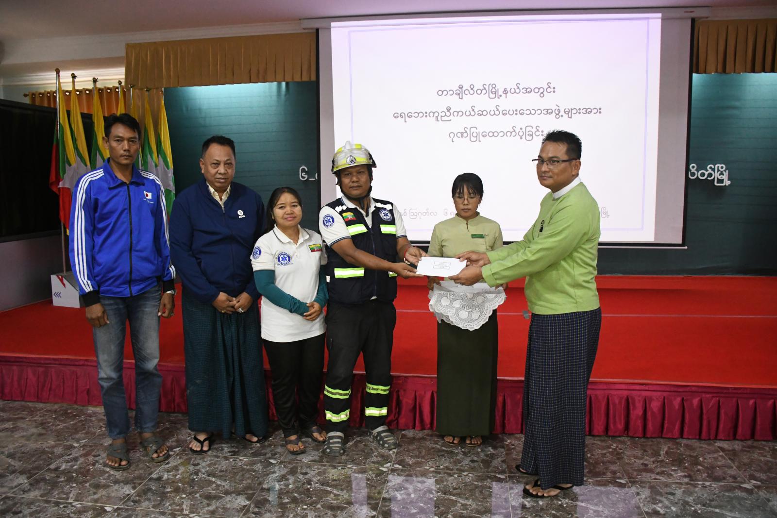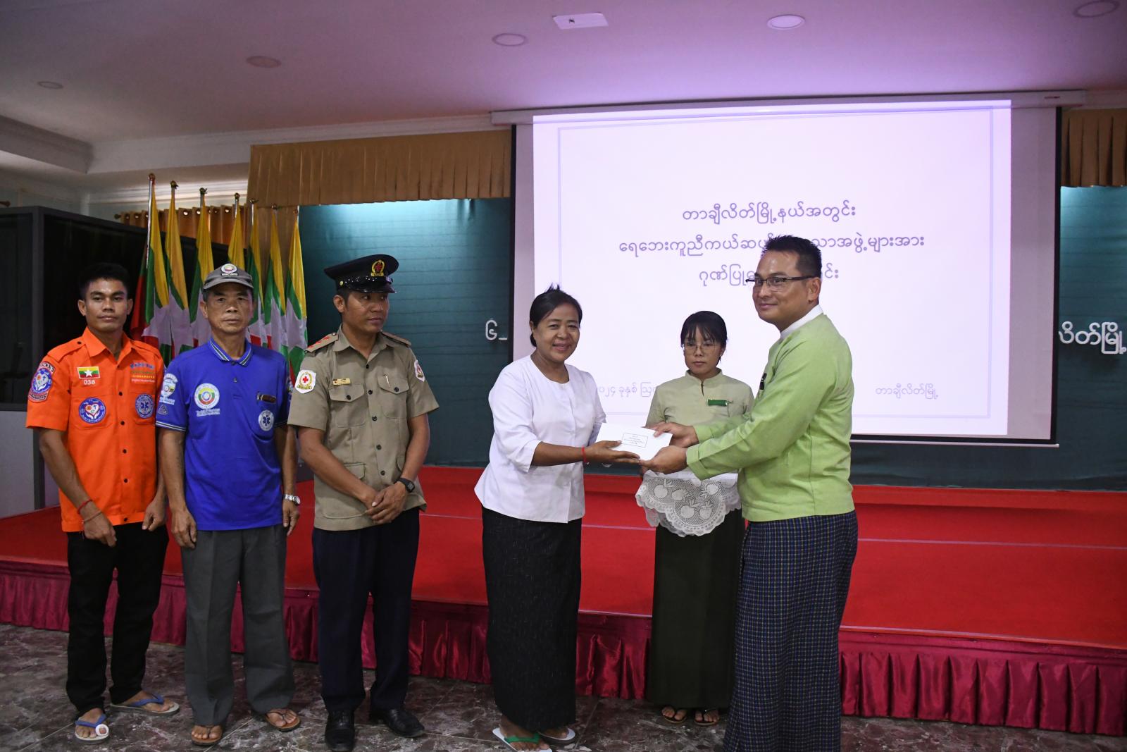 ထိုသို့ ထောက်ပံ့ပေးအပ်ရာတွင် ခရိုင်စီမံအုပ်ချုပ်ရေးအဖွဲ့ဥက္ကဋ္ဌ ဦးမင်းကိုက တာချီလိတ်မြို့၌ ၂၀၂၄ ခုနှစ်၊ ဇူလိုင်လ (၂၉) ရက်နေ့မှစတင်၍ မိုးများအဆက်မပြတ်ရွာသွန်းမှုကြောင့် မယ်ဆိုင်ချောင်းရေသည် စိုးရိမ်ရေမှတ်ကျော်လွန်ကာ ဗိုလ်ချုပ်လမ်းမကြီးနှင့် ရပ်ကွက်များအတွင်း ဩဂုတ်လ (၁) ရက်နေ့မှ (၄) ရက်နေ့အထိ ရေကြီးရေလျှံမှုများဖြစ်ပွားခဲ့ရာ ရေနစ်မြုပ်သည့် ရပ်ကွက်များအတွင်းရှိ ရေးဘေးသင့်ပြည်သူများအား ရေဘေးကယ်ဆယ်ရေးလုပ်ငန်းများ စွမ်းစွမ်းတမံ ကူညီဆောင်ရွက်ပေးခဲ့ကြသော မြို့နယ်ကြက်ခြေနီသူနာပြုတပ်ဖွဲ့များ၊ ပရဟိတလူမှုကူညီရေး အသင်းအဖွဲ့များအား ဂုဏ်ပြုထောက်ပံ့ငွေများ ပေးအပ်ခဲ့သည်။