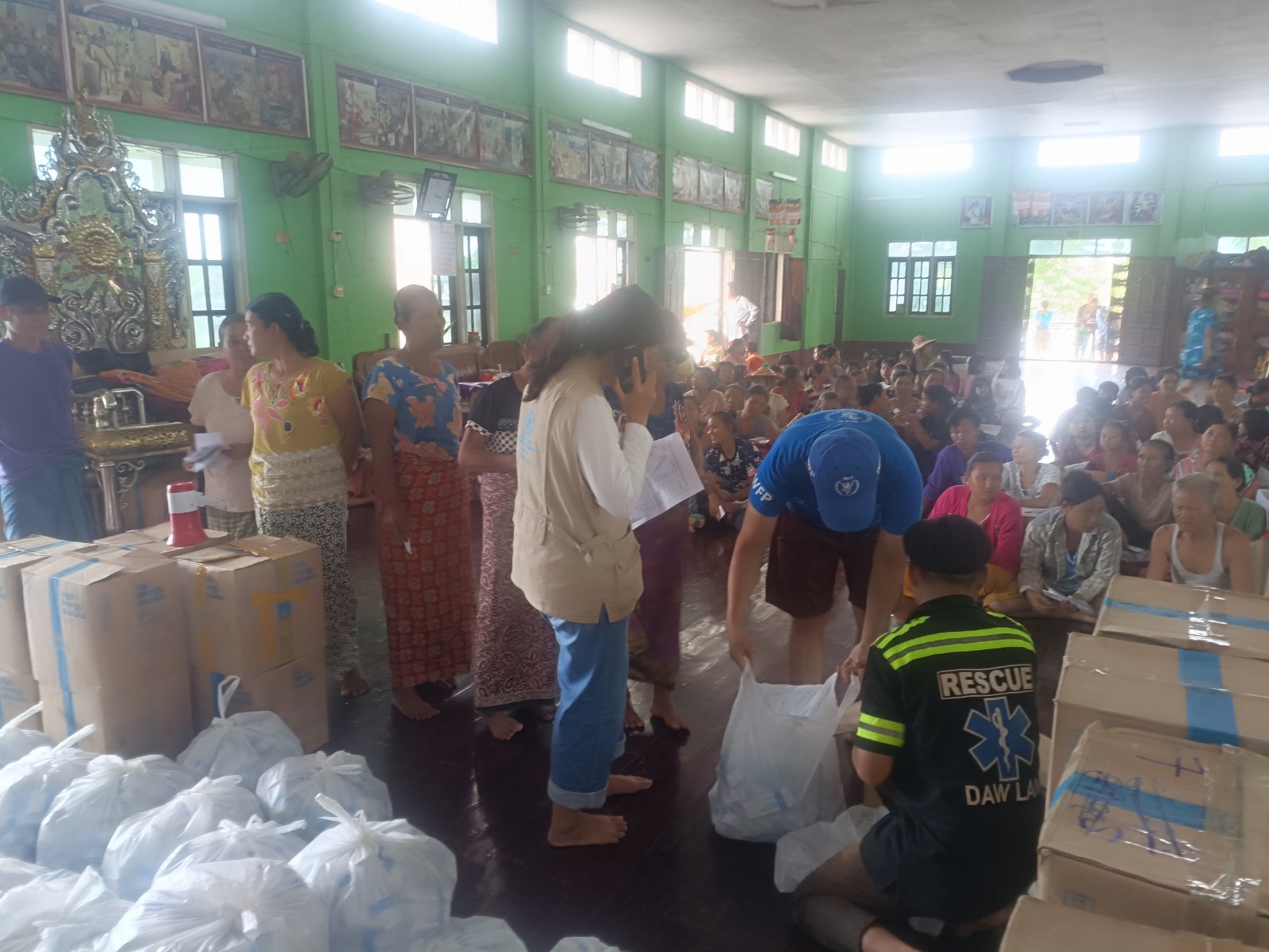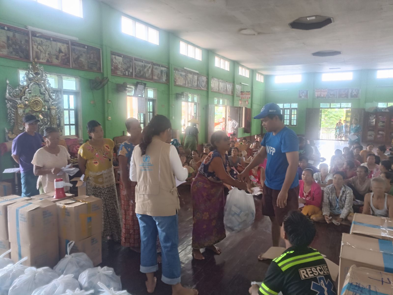 ထောက်ပံ့ခြင်းလုပ်ငန်းကို ကမ္ဘာ့စားနပ်ရိက္ခာ အစီအစဉ်(W.F.P)မှ ကွင်းဆင်းကြီးကြပ်ရေးလက်ထောက် ဦးအိုက်ညီနှင့် တာဝန်ရှိသူများတို့က ရေဘေးသင့်ပြည်သူများထံ လက်ဝယ်အရောက် ရရှိရေးအတွက် ကျေးရွာအရောက် ကွင်းဆင်းထောက်ပံ့ခဲ့ကြောင်း သိရသည်။