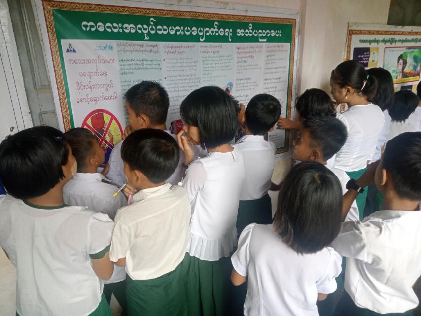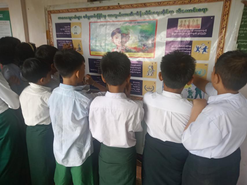 ထို့နောက် ပြန်ကြားရေးနှင့်ပြည်သူ့ဆက်ဆံရေးဦးစီးဌာနမှ ခင်းကျင်းပြသထားသည့် မူးယစ်ဆေးဝါးအန္တရာယ်သတိပြုကာကွယ်ရေး၊ လူကုန်ကူးမှုတိုက်ဖျက်ရေး၊ ကလေးအလုပ်သမားပပျောက်ရေး စသည့်အသိပညာပေး နံရံကပ်စာစောင်များကို ခင်းကျင်းပြသခဲ့ရာ ကျောင်းသား၊ ကျောင်းသူများက စိတ်ပါ၀င်စားစွာ ကြည့်ရှုလေ့လာခဲ့ကြောင်း သိရသည်။