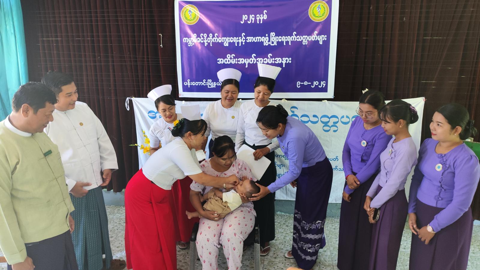 ထို့နောက် မြို့နယ်စီမံအုပ်ချုပ်ရေးအဖွဲ့ဥက္ကဋ္ဌ ဦးအောင်သူရ၊ မြို့နယ်ပြည်သူ့ကျန်းမာရေးဦးစီးဌာနမှူးဒေါက်တာသန်းထိုက်စိုး၊ မြို့နယ်အမျိုးသမီးရေးရာအဖွဲ့နှင့် မိခင်နှင့်ကလေးစောင့်ရှောက်ရေးအသင်းအဖွဲ့ဝင်များ၊ မြို့နယ်ပြည်သူ့ကျန်းမာရေးဝန်ထမ်းများက အသက်(၆)လမှ (၅)နှစ်အတွင်းကလေးများအား ဗီတာမင်အေ တိုက်ကျွေးခြင်း၊ ကိုယ်ဝန်ဆောင်မိခင်နှင့်နို့တိုက်မိခင်များအား သံဓာတ်ဆေးပြားနှင့် ဗီတာမင်ဘီဝမ်းဆေးပြား တိုက်ကျွေးခြင်းတို့ပြုလုပ်ခဲ့ပြီး အာဟာရဖွံ့ဖြိုးရေးထောက်ပံ့ပစ္စည်းများပေးအပ်ခဲ့ကြောင်း သိရသည်။