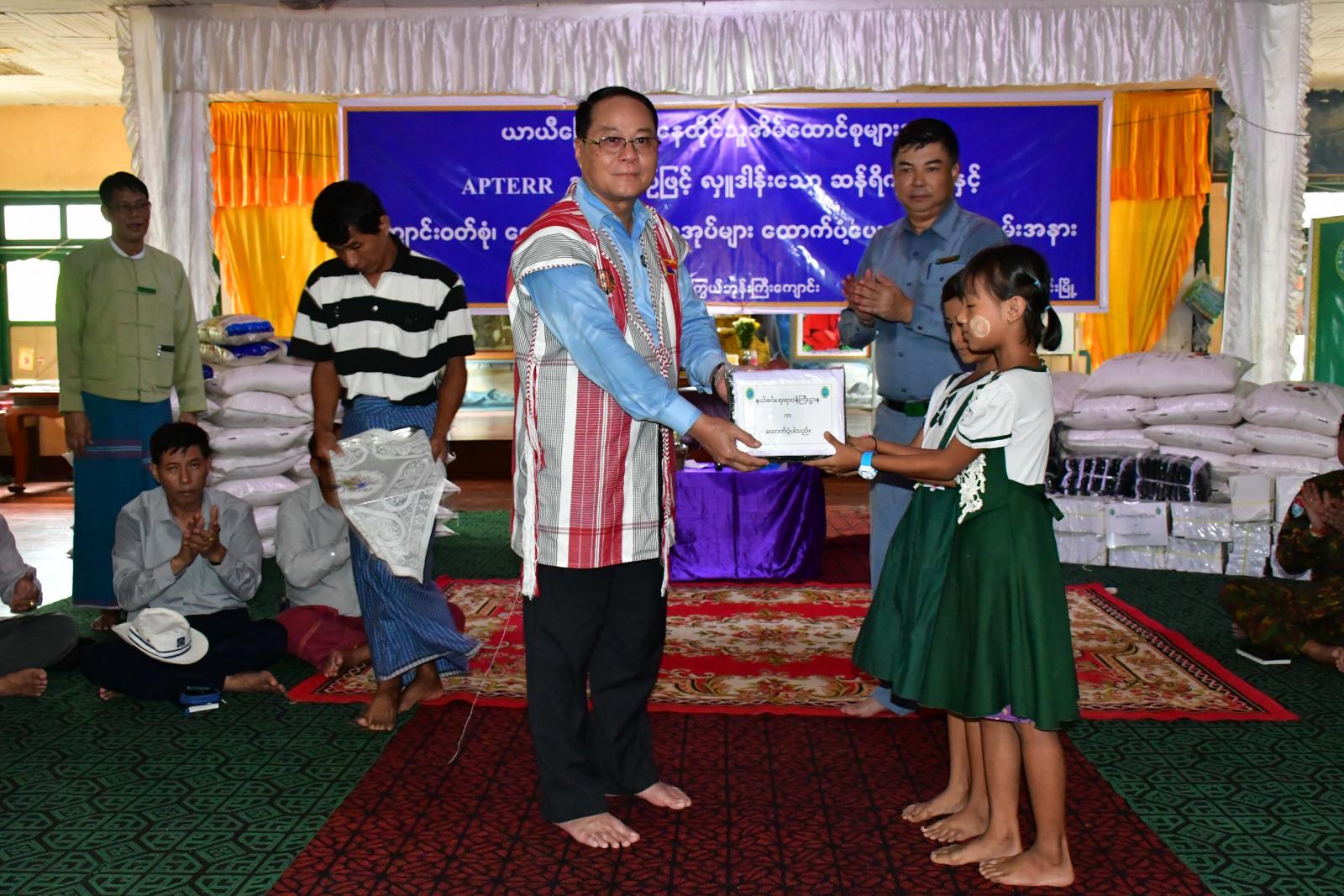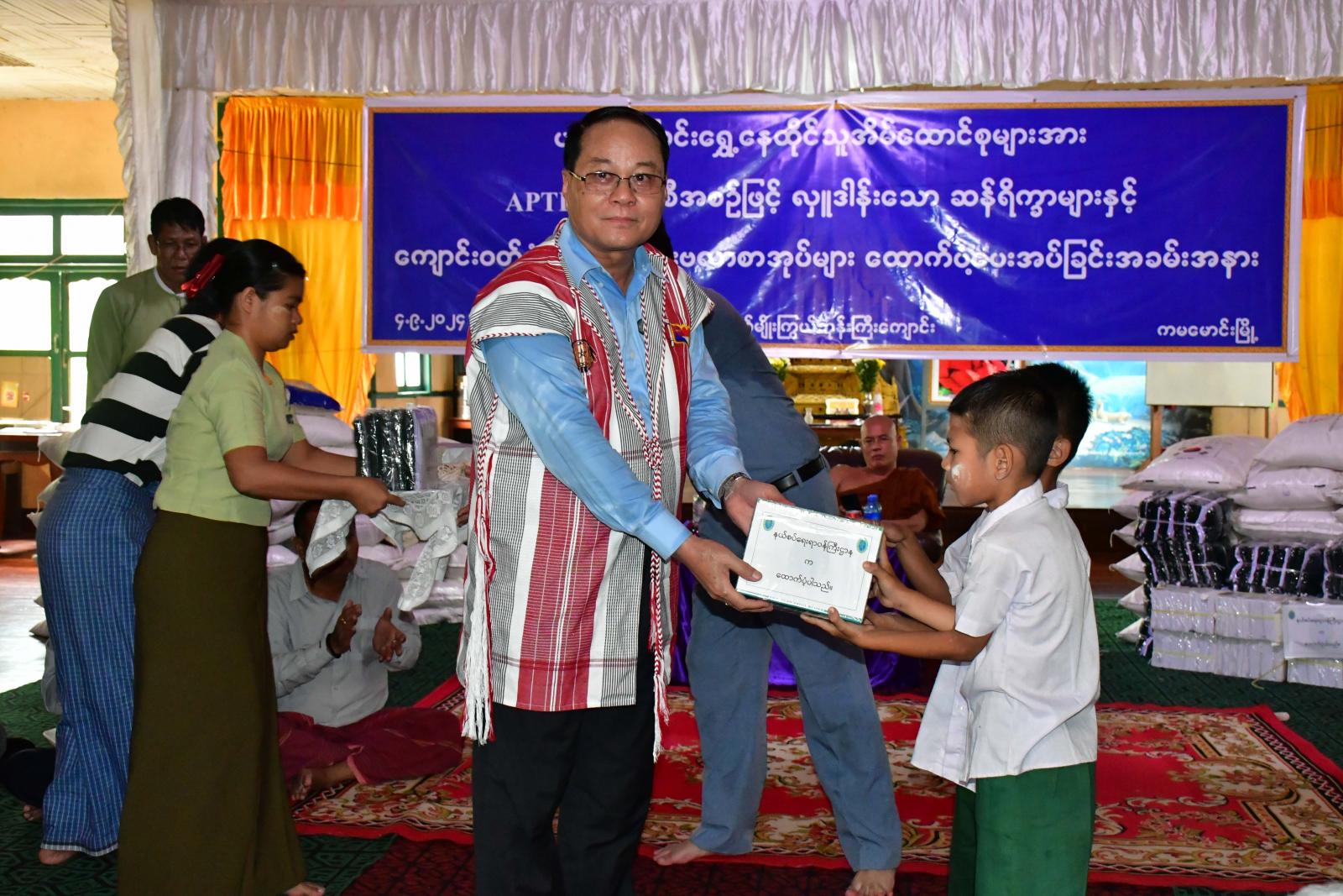 ဆက်လက်၍ ပြည်နယ်ဝန်ကြီးချုပ်နှင့်အဖွဲ့သည် ဖာပွန်ခရိုင်၊ ကမမောင်းမြို့၊ ရွှေမြတ်မျိုးကြွယ် ပရိယတ္တိစာသင်တိုက်၌ ယာယီပြောင်းရွှေ့နေထိုင်သူ အိမ်ထောင်စုများအား APTERR အစီအစဉ်ဖြင့် လှူဒါန်းသောဆန်ရိက္ခာများ၊ ကျောင်းဝတ်စုံ၊ ကျောင်းသုံးဗလာစာအုပ်များ ထောက်ပံ့ပေးအပ်ရာ ပြည်နယ်ဝန်ကြီးချုပ်က ယာယီပြောင်းရွှေ့ နေထိုင်စဉ်ကာလအတွင်း တစ်ဦးနှင့်တစ်ဦးချစ်ချစ်ခင်ခင် ဖြင့် စည်းလုံးညီညွှတ်စွာနေထိုင်ကြစေလိုပြီး လက်ရှိဖြစ်ပေါ်နေသည့် ပဠိပက္ခများကို နည်းလမ်း အမျိုးမျိုးဖြင့် ချုပ်ငြိမ်းသွားစေရန် တာဝန်ရှိသူများမှ ကြိုးပမ်းဆောင်ရွက်လျက်ရှိကာ မိမိတို့၏ မူလနေရပ်များသို့ ပြန်လည်ပြောင်းရွှေ့နေထိုင်နိုင်ရေး ကြိုးပမ်းဆောင်ရွက်လျက်ရှိကြောင်း၊ ကျောင်းနေအရွယ်ကလေးတိုင်း ကျောင်းနေနိုင်ရေး ကြိုးပမ်းဆောင်ရွက်ပေးကြစေလိုပြီး လိုအပ်သည့် ပညာရေး၊ ကျန်းမာရေး စောင့်ရှောက်မှုများကိုလည်း ဆောင်ရွက်ပေးထားကာ ပြည်နယ်အစိုးရအဖွဲ့၊ ပြည်ထောင်စုအစိုးရအဖွဲ့၊ လူမှုရေးအဖွဲ့အစည်းများနှင့် စေတနာရှင်၊ အလှူရှင်များကလည်း လိုအပ်သည့် ကူညီထောက်ပံ့မှုများကို ဆောင်ရွက်ပေးလျက်ရှိကြောင်း အားပေးစကားများ ပြောကြား သည်။