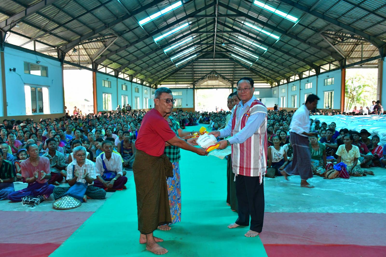 ထို့နောက် ပြည်နယ်ဝန်ကြီးချုပ်နှင့်အဖွဲ့သည် မြိုင်ကြီးငူအထူးဒေသ အေးလင်းသာယာ ကျောက်စာကွင်း၌ ယာယီပြောင်းရွှေ့နေထိုင်သူအိမ်ထောင်စုများအား APTERR အစီအစဉ်ဖြင့် လှူဒါန်းသောဆန်ရိက္ခာများ ထောက်ပံ့ပေးအပ်ရာ ပြည်နယ်ဝန်ကြီးချုပ်က ယာယီနေထိုင်စဉ်ကာလ အတွင်း စည်းစည်းလုံးလုံးနေထိုင်ကြစေလိုပြီး ကျန်းမာရေးကို အထူးဂရုစိုက်ကြရန်၊ တစ်ကိုယ်ရည် သန့်ရှင်းရေး၊ ပတ်ဝန်းကျင်သန့်ရှင်းရေးဂရုပြုကြရန်၊ ကျောင်းနေအရွယ်ကလေးငယ်များ ကျောင်းအပ်နှံ၍ ပညာရေးနှောင့်နှေးမှုမရှိစေရေး ကြိုးစားဆောင်ရွက်ကြရန်၊ စည်းကမ်းနှင့်အညီ နေထိုင်ပြီး တာဝန်ရှိသူများ၏ပြောဆိုဆုံးမမှုများကိုနာခံ၍ ဆရာတော်ကြီးများနှင့်ဂေါပကအဖွဲ့များ၏ ဆုံးမဩဝါဒနှင့်အညီ နေထိုင်ကြရန် အားပေးစကားများပြောကြားပြီး ပြည်နယ်ဝန်ကြီးချုပ်၊ ပြည်နယ်အစိုးရအဖွဲ့ဝင်များနှင့် တာဝန်ရှိသူများက မြိုင်ကြီးငူအထူးဒေသရှိ ယာယီပြောင်းရွှေ့နေထိုင်သူ အိမ်ထောင်စု ၁၀၅၆ စု လူဦးရေ ၅၅၂၆ ဦးအတွက် APTERR အစီအစဉ်ဖြင့်လှူဒါန်းသော ၄၀ ကီလိုဂရမ် ဆန်အိတ် ၉၆၇ အိတ်ကို ထောက်ပံ့ပေးအပ်ခဲ့ကြကာ ယာယီပြောင်းရွှေ့နေထိုင်သူများအား ရင်းနှီးနွေးထွေးစွာ တွေ့ဆုံနှုတ်ဆက်၍ အားပေးစကားများပြောကြားခဲ့ကြသည်။