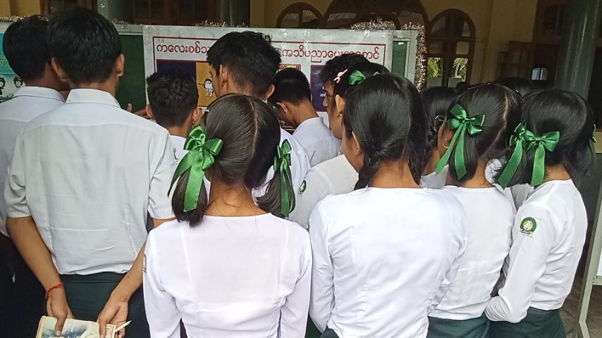 ထို့နောက် ပြန်ကြားရေးနှင့်ပြည်သူ့ဆက်ဆံရေးဦးစီးဌာနမှ ကျောင်းသား၊ ကျောင်းသူများ ဖတ်ရှုလေ့လာနိုင်ရန် ရုပ်ပြပုံပြင်များ၊ စာစောင်များစသည့် ကလေးများအသိပညာတိုးပွားရေး စာအုပ်စာပေများ၊ စာဖတ်ရှိန်မြှင့်တင်ရေးတို့နှင့်ပတ်သက်သည့် ဆောင်းပါး၊ ကဗျာ၊ ကာတွန်းသိမှတ်ဖွယ်ရာများစသည့် အသိပညာပေးနံရံကပ်စာစောင်များဓာတ်ပုံများကို ခင်းကျင်းပြသခဲ့ရာ ကျောင်းသား၊ ကျောင်းသူများက စိတ်ပါ၀င်စားစွာကြည့်ရှုလေ့လာခဲ့ကြောင်း သိရသည်။