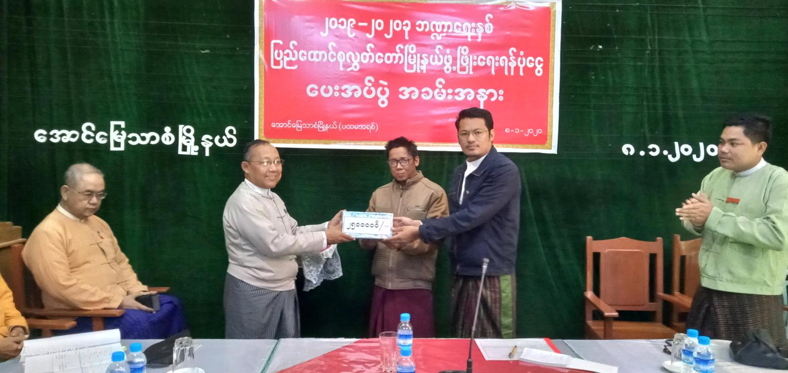 ဆက်လက်၍ ဒေသဖွံ့ဖြိုးရေးလုပ်ငန်းများဆောင်ရွက်နိုင်ရန်အတွက် ပြည်ထောင်စုလွှတ်တော် ရန်ပုံငွေ (ပထမအရစ်)များကို မြို့နယ်ဖွံ့ဖြိုးရေးလုပ်ငန်း အကောင်အထည်ဖော်ရေးအဖွဲ့ ဥက္ကဋ္ဌ နှင့် တာဝန်ရှိသူများက ပေးအပ်ကြရာ ရပ်ကွက်အုပ်ချုပ်ရေးမှူးများနှင့် ရပ်ကွက်လုပ်ငန်းကြီးကြပ်မှု ကော်မတီဥက္ကဋ္ဌများက လက်ခံရယူကြသည်။ ထို့နောက် မြို့နယ်ဖွံ့ဖြိုးရေးလုပ်ငန်း အကောင်အထည်ဖော်ရေးအဖွဲ့ ဒုတိယဥက္ကဋ္ဌ အမျိုးသား လွှတ်တော်ကိုယ်စားလှယ် ဒေါက်တာသန်းဝင်းက နိဂုံးချုပ်စကားပြောကြားပြီးအခမ်းအနားကို ရုပ်သိမ်းခဲ့သည်။