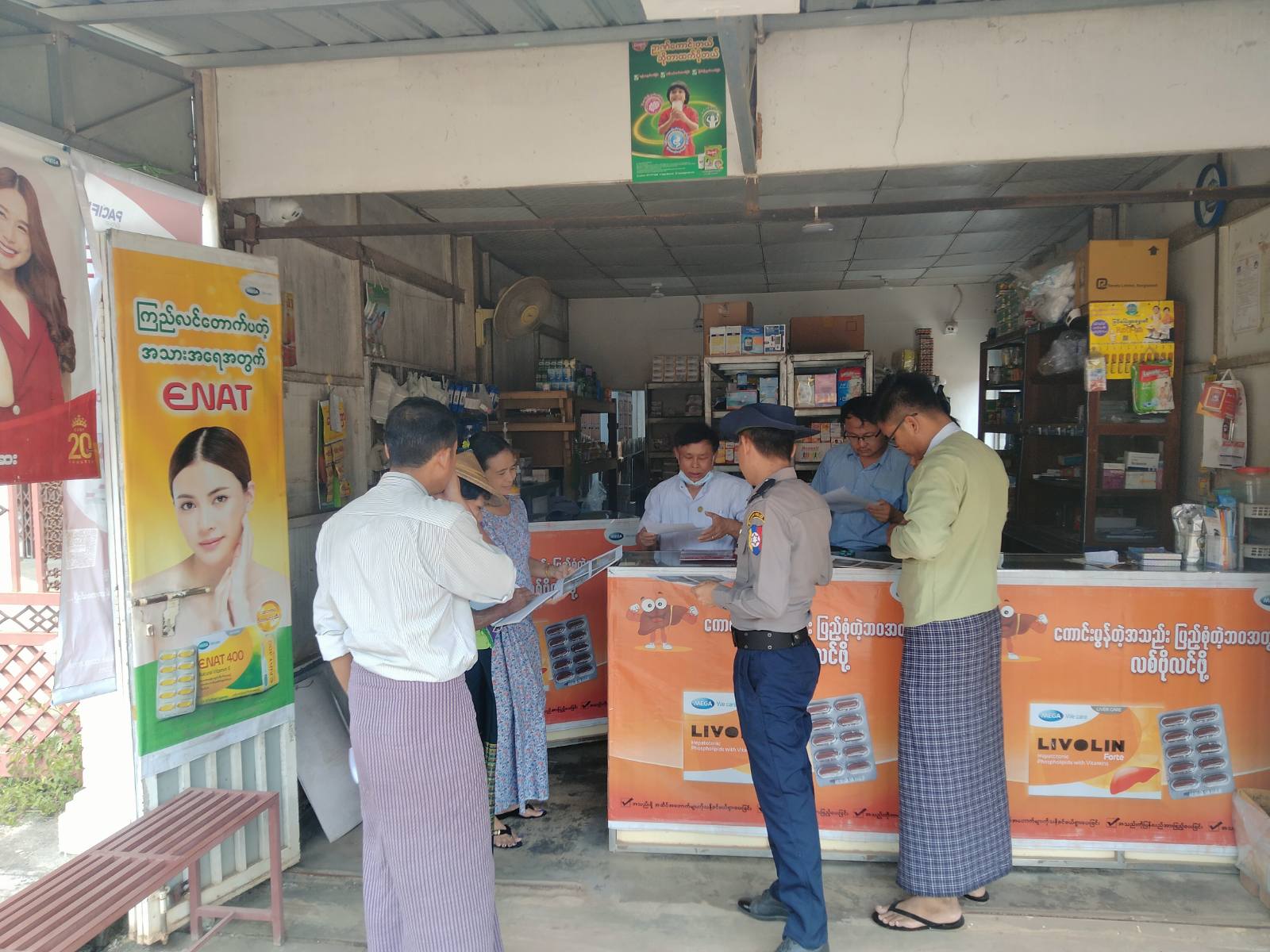 ကွင်းဆင်းစစ်ဆေးရာတွင် မြို့နယ်ကျန်းမာရေးဦးစီးဌာန ဆရာဝန်ကြီး ဒေါက်တာလှဝင်း၊ မြို့နယ်အထွေထွေအုပ်ချုပ်ရေးဦးစီးဌာန၊ မြို့နယ်စားသုံးရေးရာဦးစီးဌာန၊ မြို့နယ်စည်ပင်သာယာရေးအဖွဲ့၊ မြို့မရဲစခန်းမှရဲတပ်ဖွဲ့ဝင်များနှင့် တာဝန်ရှိသူများက ဆေးဆိုင်များအတွင်း သိုလှောင်ထားရှိသော ဆေးဝါးများနှင့် ပတ်သက်၍ ထိန်းချုပ်ဆေးဝါးများ ရောင်းချနေမှု ရှိ/မရှိ၊ သက်တမ်းလွန်ဆေးဝါးနှင့် ဆက်စပ်ဆေးများ ရောင်းချနေမှု ရှိ/မရှိ၊ ဆေးဆိုင်အတွင်း သန့်ရှင်းသပ်ရပ်မှု၊ ဥပဒေနှင့် မလွတ်ကင်းသည့် ဆေးဝါးများ ရောင်းချခြင်းရှိ / မရှိ၊ လုပ်ငန်းလိုင်စင်ရောင်းချခွင့်လိုင်စင်များ ရှိ/မရှိ၊ စပ်ဆေးများရောင်းချခြင်း ရှိ/မရှိတို့ကို စစ်ဆေးခြင်းများ ပြုလုပ်ခဲ့ကြောင်းနှင့် အသိပညာပေးဆွေးနွေးမှုများ ဆောင်ရွက်ခဲ့ကြောင်း သိရသည်။