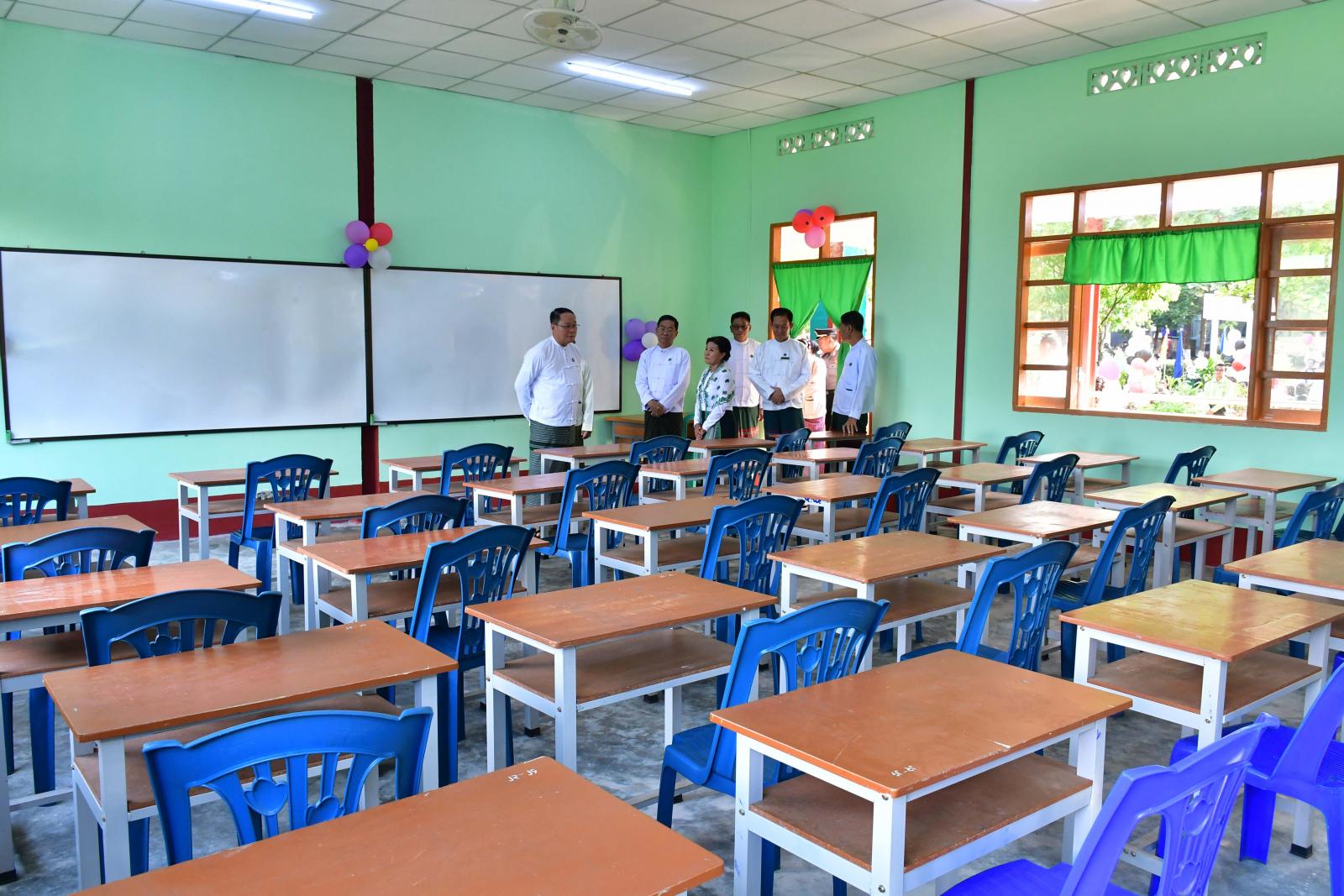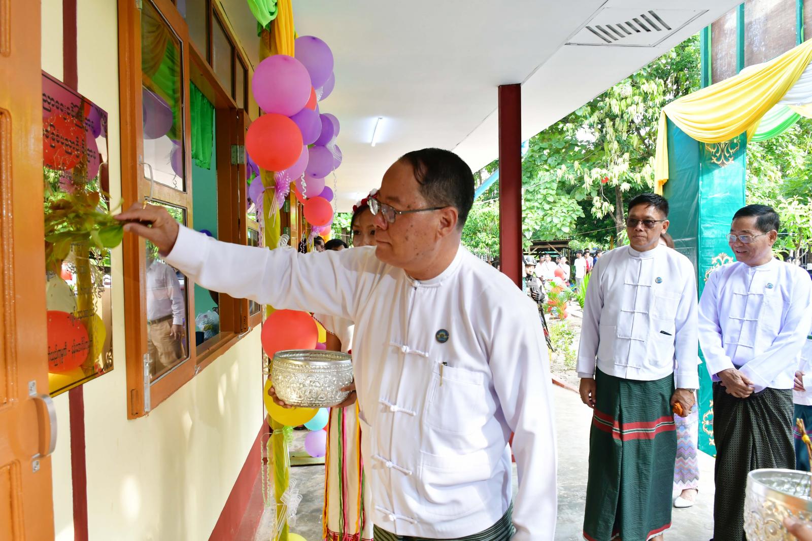ဆက်လက်၍ ကျောင်းဆောင်သစ်လွှဲပြောင်းပေးအပ်ပွဲကို အဆိုပါကျောင်းဆောင်သစ်၌ ကျင်းပရာ ပြည်နယ်ဝန်ကြီးချုပ်က ယနေ့ဖွင့်လှစ်သည့်ကျောင်းဆောင်သစ်အား ရှေရှည်တည်တံ့ရန်နှင့် အစဉ်သန့်ရှင်းသာယာလှပစေရန် တာဝန်ထမ်းဆောင်နေကြသော ကျောင်းအုပ်ကြီးနှင့် ဆရာ၊ ဆရာမများက ထိန်းသိမ်းစောင့်ရှောက်၍ ကျောင်းအကျိုးတော်ဆောင်များ၊ မိဘများကလည်း ပံ့ပိုးဖြည့်ဆည်းပေးကြစေလိုကြောင်း၊ ကျောင်းကော်မတီများ၊ အကျိုးတော်ဆောင်များ၊ မိဘများအနေဖြင့် မိမိတို့၏ သားသမီးပညာသင်ကြားခွင့်ကို လမ်းကြောင်းအမှန်သို့ရောက်အောင် လမ်းညွှန်ပေးကြရန်နှင့် ဆရာ၊ ဆရာမများအနေဖြင့်လည်း ပညာရည်ထူးချွန်ပြီး နိုင်ငံအတွက် အားထားရသည့် ဗလငါးတန်နှင့် ပြည့်စုံသော တပည့်ကောင်းများ ပေါ်ထွက်အောင် သင်ကြားပေးကြစေလိုကြောင်း တိုက်တွန်းပြောကြားသည်။