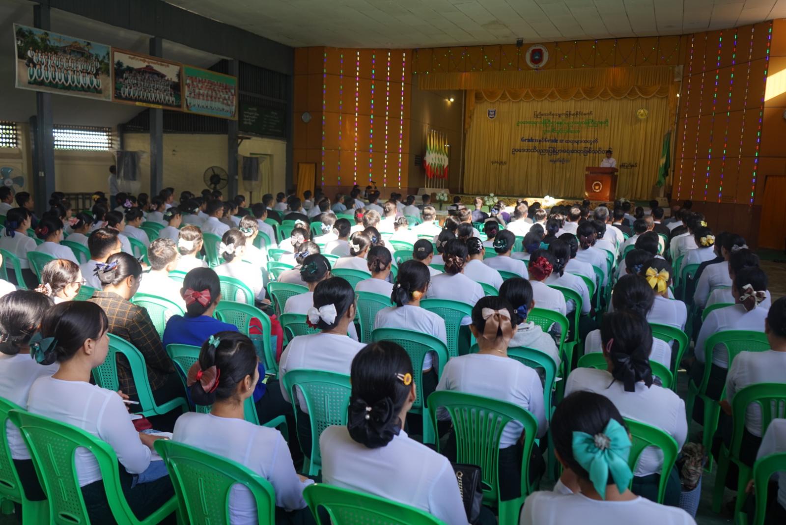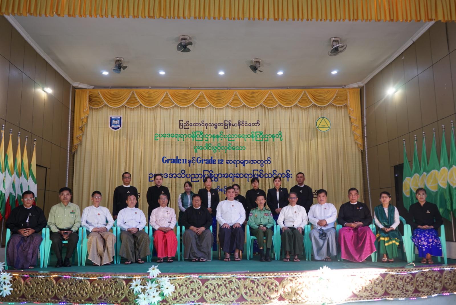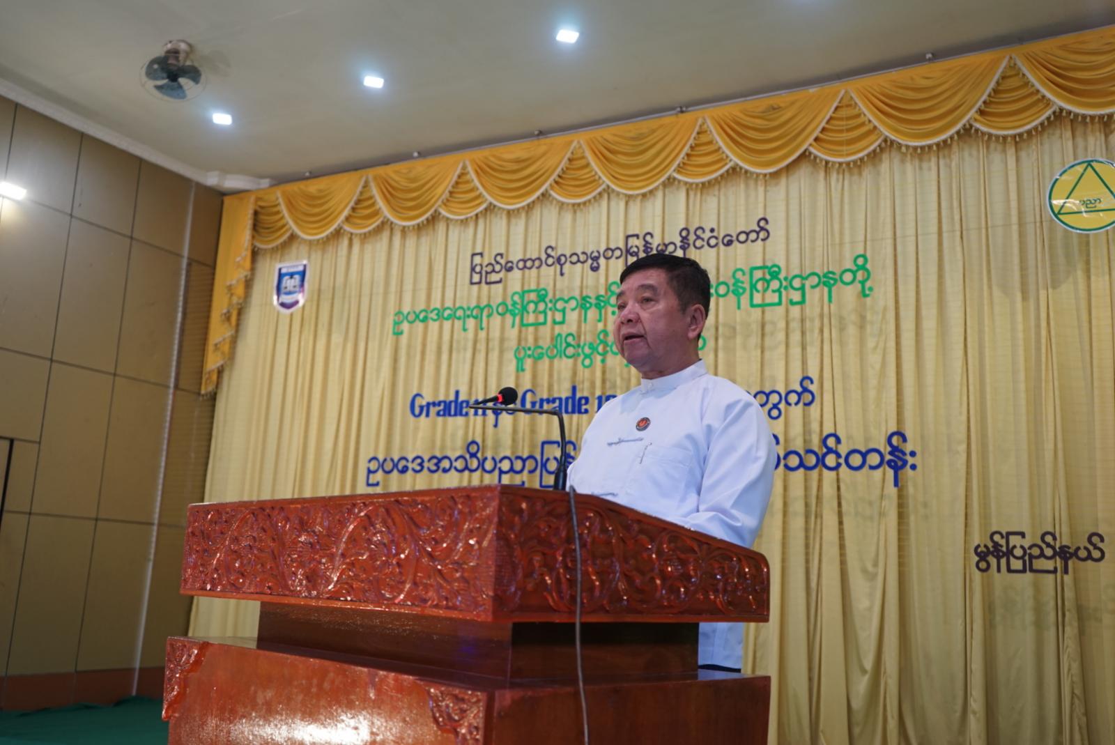 ရှေးဦးစွာ အခမ်းအနားတွင် ပြည်နယ်ဝန်ကြီးချုပ် ဦးအောင်ကြည်သိန်းကမိမိတို့ နိုင်ငံသားတိုင်းအနေဖြင့် ဥပဒေကို သိရှိလိုက်နာရန်လိုအပ်ပြီး ဥပဒေပညာရပ်ကို ကျယ်ပြန့်စွာ သင်ကြားပေးနိုင်ရန် အသိပညာပေးခြင်းသည် အရေးပါသောအခန်းကဏ္ဍတွင် ပါဝင်နေပါကြောင်း၊ ဥပဒေဆိုသည်မှာ နိုင်ငံတစ်နိုင်ငံအတွက် မရှိမဖြစ်လိုအပ်သည့် အရာတစ်ခုဖြစ်သည့်အပြင်မိမိတို့နိုင်ငံအတွင်းနေထိုင်သည့်နိုင်ငံသားများ၊ ပြည်သူများ မဖြစ်မနေသိရှိလိုက်နာ စောင့်ထိန်းကြရမည့် သတ်မှတ်ပြဌာန်းချက်တစ်ရပ်လည်းဖြစ်ကြောင်း၊ နိုင်ငံတော်စီမံအုပ်ချုပ်ရေးကောင်စီအနေဖြင့် နိုင်ငံတော်၏တာဝန်ကို ဖွဲ့စည်းပုံအခြေခံဥပဒေနှင့်အညီ စတင်တာဝန်ယူဆောင်ရွက်သည့်အချိန်မှစ၍ နိုင်ငံတော်တည်ငြိမ်အေးချမ်းရေးနှင့်တရားဥပဒေစိုးမိုးရေး၊ နိုင်ငံ့စီးပွားမြှင့်တင်ရေးနှင့် ပြည်သူလူထုတစ်ရပ်လုံး လူမှုစီးပွားဘဝတိုးတက်ဖြစ်ထွန်းစေရေးအတွက် မူဝါဒများချမှတ် အကောင်အထည် ဖော်ဆောင်ရွက်ခြင်း၊ ခေတ်စနစ်နှင့်အညီ လျော်ညီစေမည့် ဥပဒေများ၊ နည်းဥပဒေများ ပြဌာန်းခြင်း၊ ပြင်ဆင်ခြင်း၊ ဖျက်သိမ်းခြင်း၊ အစားထိုးဖြည့်စွက်ခြင်းဖြင့် ဆောင်ရွက်လျက်ရှိကြောင်း၊ ပြည်သူများအနေဖြင့် နိုင်ငံတော်မှပြဌာန်းထားသည့် ဥပဒေများကို သိရှိရုံဖြင့်မရရှိဘဲ ဥပဒေကို လိုက်နာစောင့်ထိန်းကြမှသာလျှင် တရားဥပဒေ စိုးမိုးရေး အားကောင်းလာမည်ဖြစ်ပါကြောင်း၊ လူ့စွမ်းအားအရင်းအမြစ်များ တိုးတက်ရှင်သန်စေရေးတွင် အခြေခံပညာ ဆရာ/ဆရာမများ၏ အခန်းကဏ္ဍသည် အလွန်အရေးပါကြောင်း၊ကျောင်းနေ အရွယ်ကလေးများကို မျိုးချစ်စိတ်ဓာတ် ရှင်သန်ထက်မြက်လာစေရန်၊ အမျိုးသားရေးစိတ်ဓာတ်များ ကိန်းအောင်းနေစေရန်၊ စည်းကမ်းကောင်းမွန်သည့် လူမျိုးဖြစ်စေရန်၊ သွန်သင်ဆုံးမ နည်းလမ်းပြသပေးကြသည့် ပုဂ္ဂိုလ်များသည် ဆရာ/ဆရာမများဖြစ်၍ အမျိုးသားစည်းကမ်းအစ စာသင်ကျောင်းကဆိုသည့်ဆောင်ပုဒ်နှင့်အညီ တပည့်များ၏ ဘဝ မတိမ်းစောင်းစေရန်၊ မှန်ကန်တည့်မတ် အောင်မြင်ကြစေရန်၊ စေတနာဖြင့် ပဲ့ပြင်ထိန်းကျောင်းပေးလျက်ရှိကြောင်း၊ ကျောင်းသား/ကျောင်းသူများ ဥပဒေပိုင်းဆိုင်ရာ အသိအမြင်များရရှိနိုင်ရေး ဥပဒေပညာရပ်ကို တက္ကသိုလ်များတွင် သင်ကြားပေးလျက်ရှိသကဲ့သို့ Grade 11 နှင့် Grade 12အတန်းများတွင် ဥပဒေပိုင်းဆိုင်ရာ အခြေခံအသိအမြင်များကို သင်ကြားပို့ချပေးကြရမည်ဖြစ်၍ ကျောင်းသား၊ ကျောင်းသူများအား အခြေခံဥပဒေဆိုင်ရာ အသိပညာများ၊ ဥပဒေဆိုင်ရာအခြေခံ အသိပညာများရရှိစေရန် သင်ကြားပို့ချနိုင်ရေးအတွက် ယခု ကျင်းပသည့် ဥပဒေအသိပညာပြန့်ပွားရေး ဆရာဖြစ်သင်တန်းတွင် ပို့ချသူများကို အထူးဂရုပြု လေ့လာမှတ်သား နာယူကြရန် တိုက်တွန်းပြောကြားလ