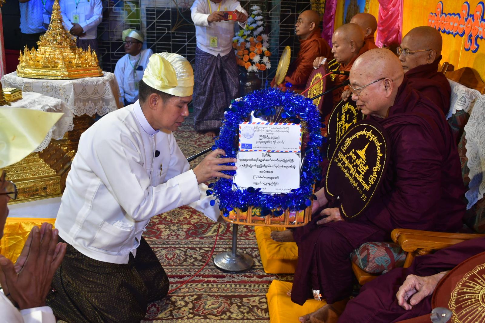 ဆက်လက်ပြီး တိုင်းဒေသကြီးအစိုးရအဖွဲ့ဝန်ကြီးများနှင့် တာဝန်ရှိသူများက ဩဝါဒါစရိယ ဆရာတော်ကြီးများထံ လှူဖွယ်ဝတ္ထုပစ္စည်းများ ဆက်ကပ်လှူဒါန်းကြသည်။ ယင်းလှူဒါန်းမှုနှင့် ကုသိုလ်ကောင်းမှုအစုစုတို့အတွက် ပြည်မြို့ ရတနာမာရ်အောင်ဆရာတော်ဘုရားကြီးက အနုမောဒနာ တရားတော်ချီးမြှင့်တော်မူကာ ဝေနေယျသတ္တဝါ အပေါင်းတို့အား ရေစက်သွန်းချ အမျှပေးဝေခဲ့ကြပြီး ဖွင့်ပွဲအခမ်းအနားကို ဗုဒ္ဓသာသနံစိရံတိဌတုသုံးကြိမ် ရွတ်ဆိုရုပ်သိမ်းခဲ့ပြီး ဗုဒ္ဓမြတ်စွယ်တော်ကို ဖွင့်လှစ်အပူဇော်ခံမည့် မြတ်စွယ်တော်တိုက် မှန်ကျောင်းဆောင်တော်သို့ ပင့်ဆောင်ခဲ့ကြသည်။