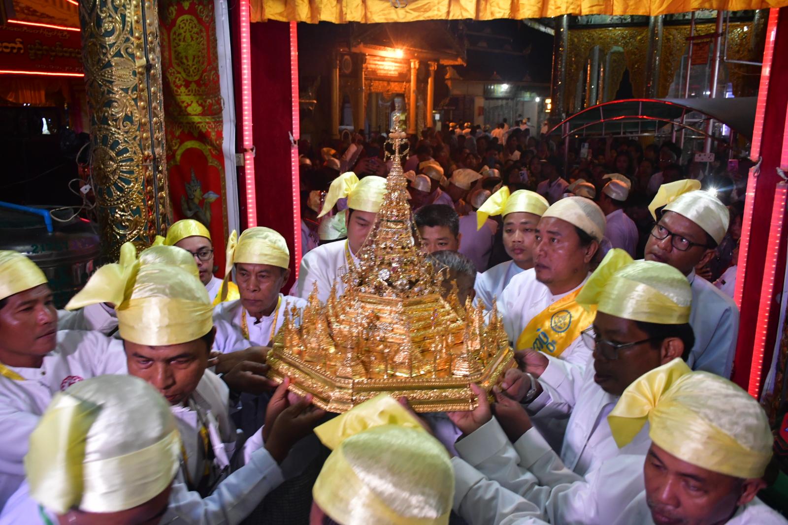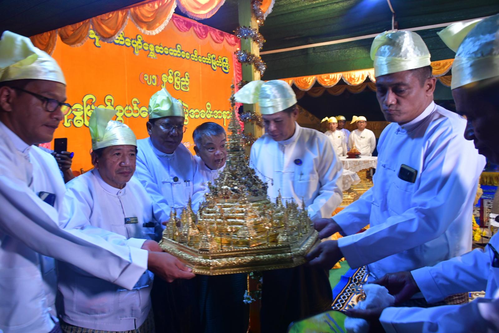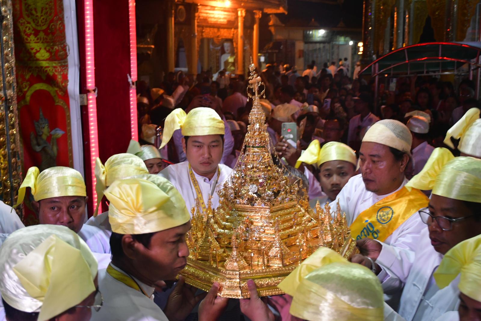 ဦးစွာ ပဲခူးတိုင်းဒေသကြီးအစိုးရအဖွဲ့၊ သယံဇာတရေးရာဝန်ကြီး ဦးတင်သိန်း၊ လူမှုရေးရာဝန်ကြီး ဦးမျိုးအောင်၊ ဒေသကွပ်ကဲရေးမှူး (ပြည်) ဗိုလ်မှူးချုပ်စိုးဦးဟန်၊ ခရိုင်စီမံအုပ်ချုပ်ရေးအဖွဲ့ဥက္ကဋ္ဌ ဦးသိန်းအောင်နှင့် တာဝန်ရှိသူများ၊ ဂေါပကအဖွဲ့ဝင်များက ဗုဒ္ဓမြတ်စွယ်တော်ကိန်းဝပ် စံပါယ်တော်မူသည့် မြတ်စွယ်တော်တိုက် ဂန္ဓကုဋီတိုက်အတွင်းမှ စိန်စေတီတော်၊ ပတ္တမြား စေတီတော်၊ ရွှေကလပ်တော်၊ မူလကြေးစေတီတော်နှင့် စန္ဒကူးကြုတ်တော်တို့ကို ကျားပျံဓမ္မာရုံ မင်္ဂလာမဏ္ဍပ်အတွင်းရှိ ယာယီပလ္လင်တော်ပေါ်များသို့ ပင့်ဆောင်ကြသည်။