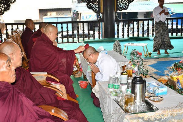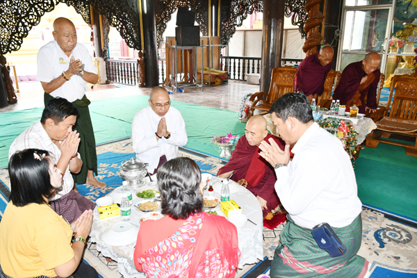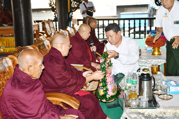 ထို့နောက်ခရိုင် အုပ်ချုပ်ရေးမှူး ဦးကောင်းစံလင်း၊ အဖွဲ့ဝင်(၂) ဦးစိန်သောင်း၊ ခရိုင်နှင့်မြို့နယ်အဆင့် ဌာနဆိုင်ရာတာဝန်ရှိသူများနှင့် ဧည့်ပရိသတ်အပေါင်းတို့က ဆရာတော်၊ သံဃာတော် အရှင်သူမြတ်တို့အား လှူဖွယ်ဝတ္ထုပစ္စည်းများနှင့် အာဟာရဒါနအာရုဏ်ဆွမ်း ဆက်ကပ်လှူဒါန်းပေးပြီး လှူဒါန်းမှုအစုစုတို့အတွက် ရေစက်သွန်းချ အမျှပေးဝေခဲ့ကြကြောင်း သိရသည်။