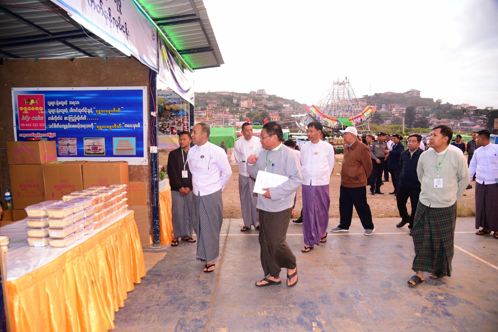 ရှမ်းပြည်နယ်အစိုးရအဖွဲ့ ပြည်နယ်ဝန်ကြီးချုပ် ဦးအောင်အောင်၊ ပြည်နယ်ဝန်ကြီးများ၊ ပြည်နယ်ဥပဒေချုပ်၊ ပြည်နယ်အစိုးရအဖွဲ့အတွင်းရေးမှူး၊ ပြည်နယ်ခရိုင်၊ မြို့နယ်အဆင့်ဌာနဆိုင်ရာများ၊ တာဝန်ရှိသူများနှင့်အတူ နိုဝင်ဘာလ (၁၂) ရက် ညနေ (၅) နာရီက တောင်ကြီးမြို့၊ အဝေရာမီးပုံးပျံကွင်း၌ တောင်ကြီးတန်ဆောင်တိုင်မီးပုံးပျံပွဲတော်တွင် MSMEs ဒေသထွက်ကုန်ပြပွဲနှင့် စျေးရောင်းပွဲတော်ကို သွားရောက်ကြည့်ရှုအားပေးခဲ့ပြီး ပွဲတော်လာပြည်သူများ၊ စျေးသည်များအား ရင်းရင်းနှီးနှီးနှုတ်ဆက်ခဲ့ကြောင်း သိရသည်။