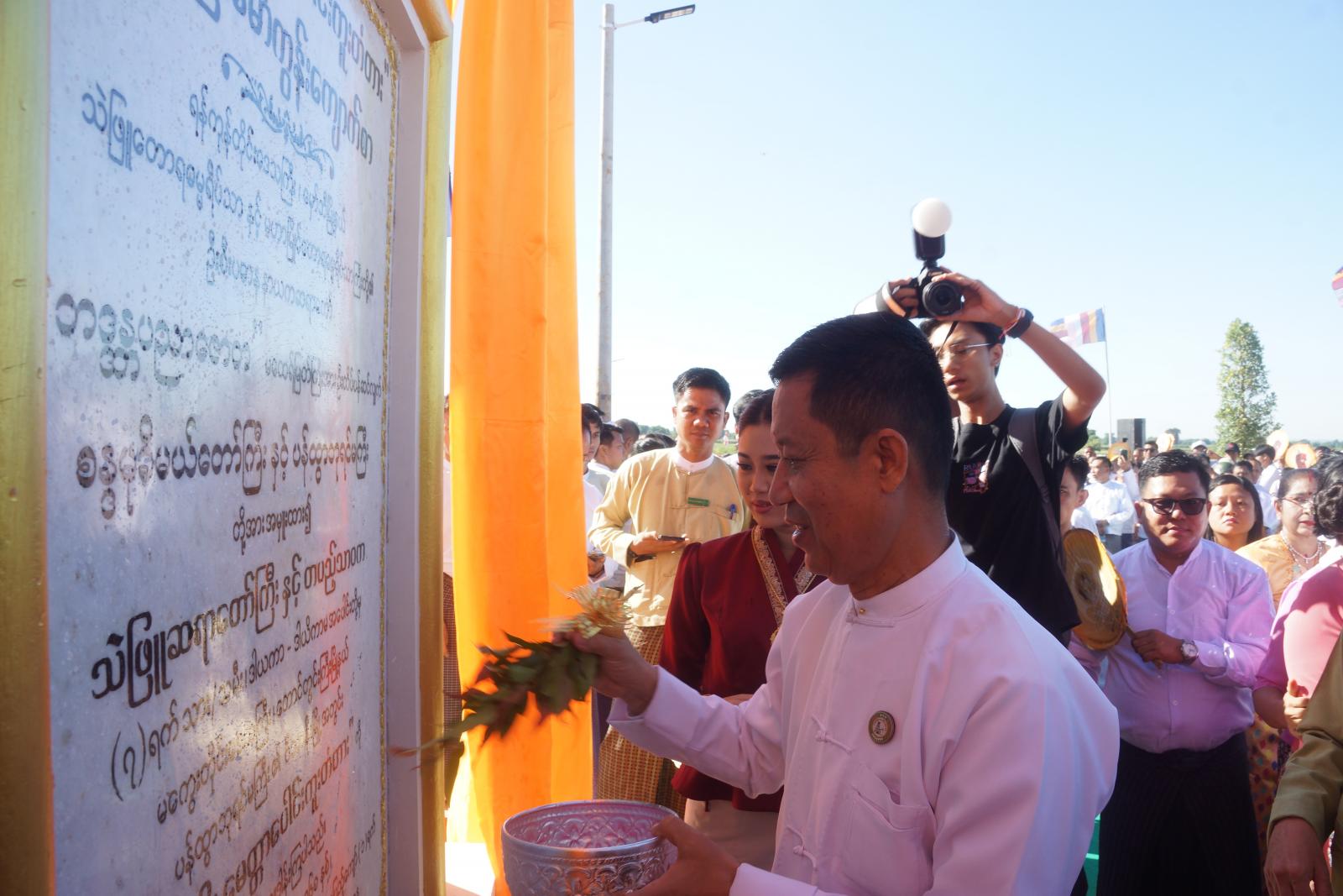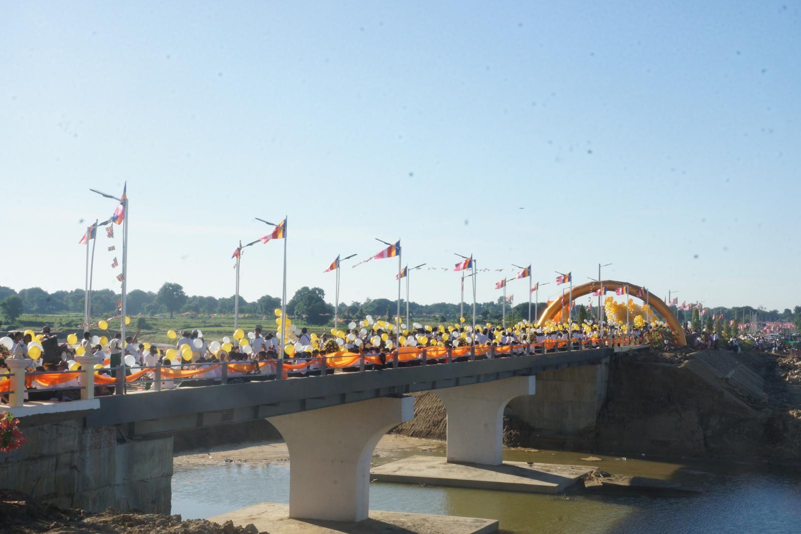 ဦးစွာ သဲဖြူမဟာမြိုင်တောရဆရာတော် ဒေါက်တာ ဘဒ္ဒန္တပညာဇောတ၊ အနောက်ပိုင်းလေတပ် ကွပ်ကဲမှု ဌာနချုပ်မှူး ဗိုလ်မှူးချုပ်သိန်းထွန်းဦး၊ သမဝါယမနှင့် ကျေးလက်ဖွံဖြိုးရေးဝန်ကြီးဌာန ဒုတိယဝန်ကြီး ဦးမြင့်စိုး၊ လုံခြုံရေးနှင့်နယ်စပ်ရေးရာဝန်ကြီးဌာန ဗိုလ်မှူးကြီး မိုးမင်းသိန်း၊ အလှူရှင် ဦးမင်းအေးတို့က ဖဲကြိုးဖြတ်ဖွင့်လှစ်ပေးခဲ့ပြီး သဲဖြူမဟာမြိုင်တောရဆရာတော် ဒေါက်တာဘဒ္ဒန္တပညာဇောတအရှင်သူမြတ်က ဗိဿနိုးမေတ္တာပေါင်းကူးတံတား ကဗ္ပည်းကျောက်စာဆိုင်းဘုတ်အား စက်ခလုတ်နှိပ်ဖွင့်လှစ်ပေးခဲ့ကာ အမွေးနံ့သာရေများ ပတ်ဖြန်းခဲ့သည်။