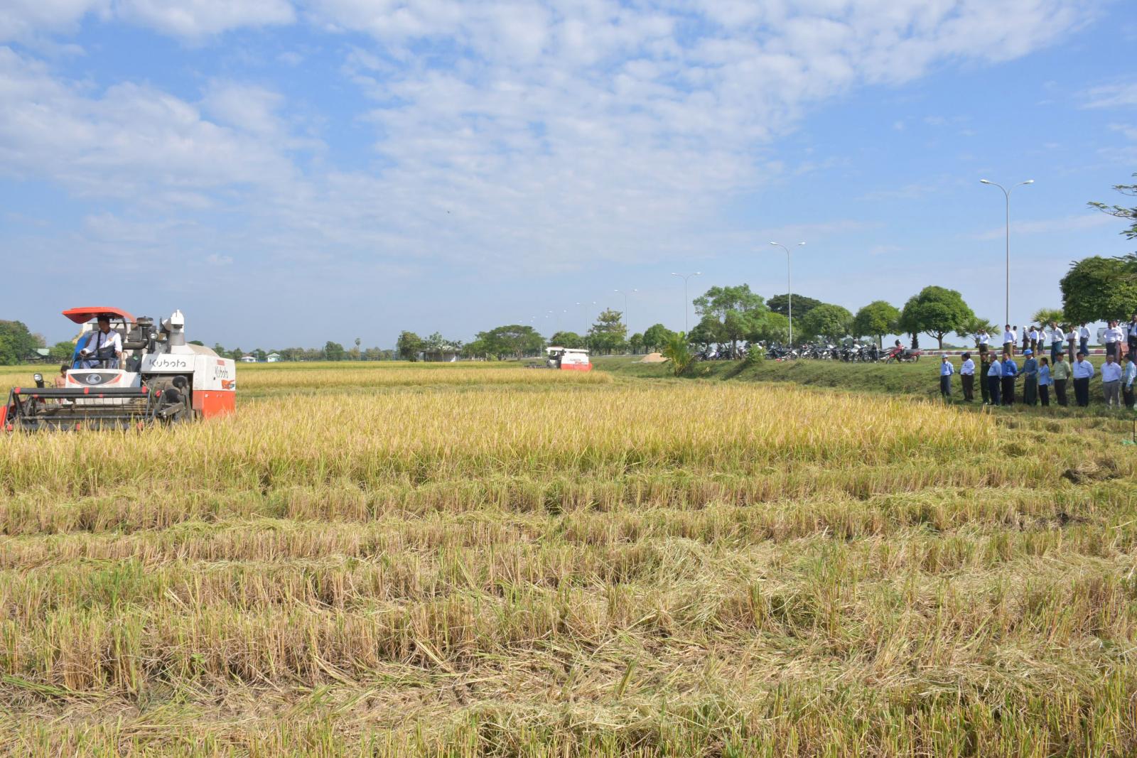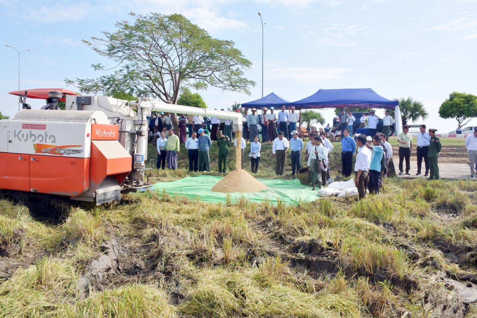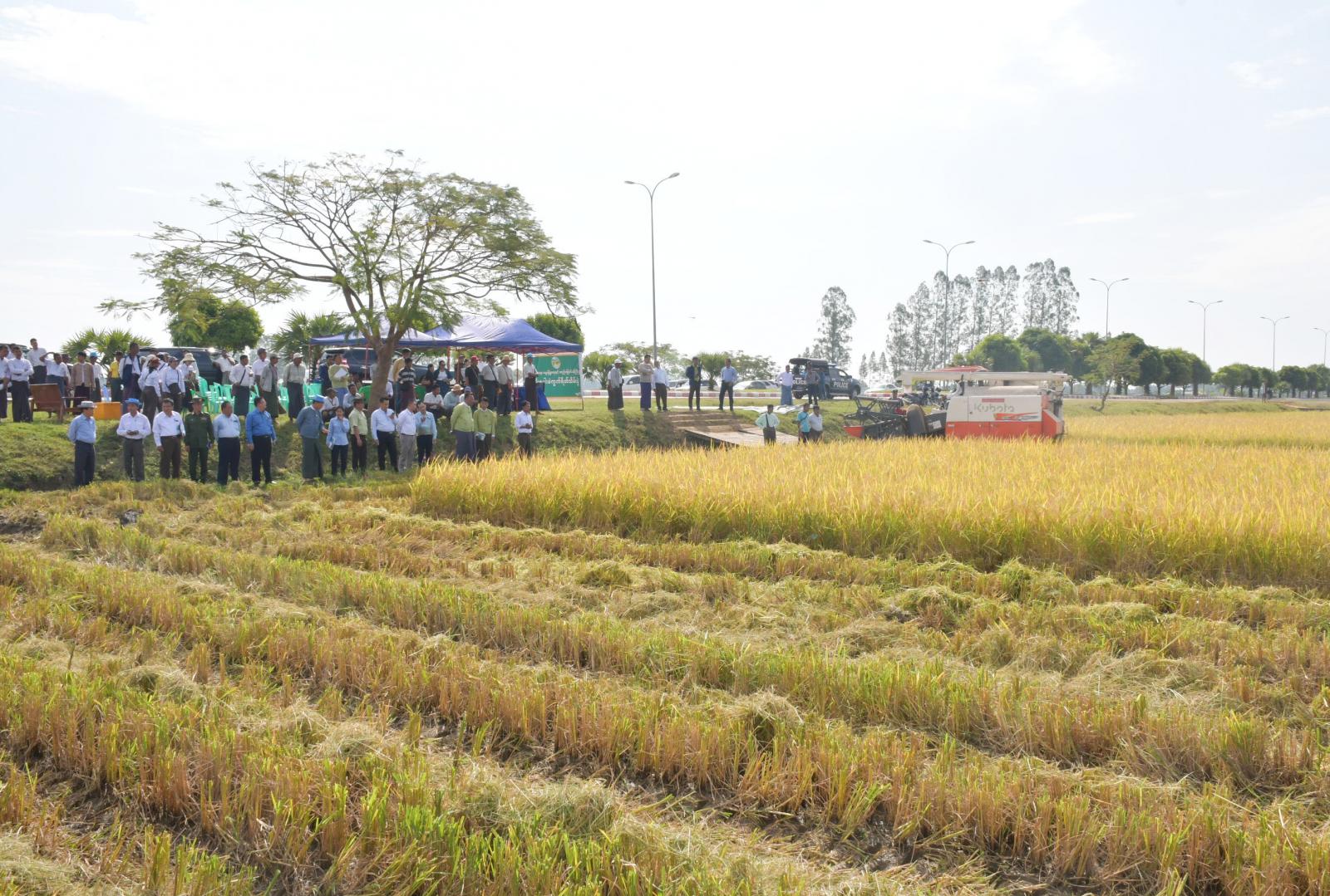 ယင်းနောက် နေပြည်တော်ကောင်စီဥက္ကဋ္ဌနှင့် တာဝန်ရှိသူများက တဲကြီးကုန်းကျေးရွာ ကွင်းအမှတ် ၁၆၅၉၊ တောင်သူ ဦးအောင်ငွေ၏ နှံကောက်စပါးမျိုး မိုးစပါးစိုက်ခင်းတွင် မိုးစပါးစံကွက် ရိတ်သိမ်းခြင်း၊ စပါးချိန်တွယ်ခြင်းများကို ကြည့်ရှုအားပေးကြရာ တစ်ဧကလျှင် စပါးအစိုထွက် (၁၄၅) တင်း၊ စပါးအခြောက်ထွက် (၁၃၀) တင်းနှုန်း ထွက်ရှိကြောင်း သိရသည်။