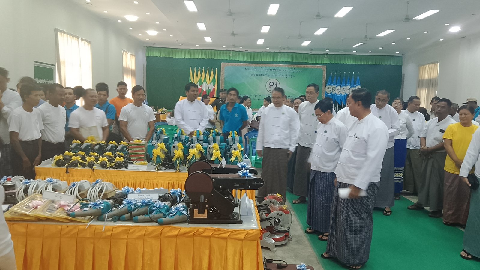 အသေးစားကုန်ထုတ်လုပ်ငန်းများ ဖန်တီးပေးနိုင်ရေးနှင့် ကျေးလက်နေမိသားစုများ ဝင်ငွေတိုးရေး စီမံကိန်းဖြင့် ဖွင့်လှစ်ခဲ့သည့် သင်တန်းများအတွက် သင်တန်းဆင်းလက်မှတ်နှင့် လုပ်ငန်းသုံးပစ္စည်းများ ပေးအပ်ပွဲ အခမ်းအနားကို ယနေ့နံနက် ၁၀ နာရီ အချိန်က နေပြည်တော် ပြည်ထောင်စုနယ်မြေ၊ ပုဗ္ဗသီရိမြို့နယ်၊ အထွေထွေအုပ်ချုပ်ရေးဦးစီးဌာန အစည်းအဝေးခန်းမတွင် ကျင်းပသည်၊၊