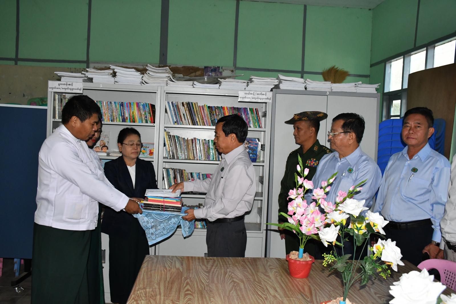 ထို့နောက် နေပြည်တော်ကောင်စီဥက္ကဋ္ဌ ဦးသန်းထွန်းဦးသည် ကျောင်းစာကြည့်တိုက်တွင် စာအုပ်စာစောင်များထားရှိမှုကို ကြည့်ရှုအားပေးကာ စာကြည့်တိုက်အတွက် စာအုပ်များနှင့် ကျောင်း ဖွံ့ဖြိုးတိုတက်ရေးဆောင်ရွက်ရန်အတွက် နေပြည်တော်ကောင်စီမှ ထောက်ပံ့ငွေများကို ပေးအပ်သည်။