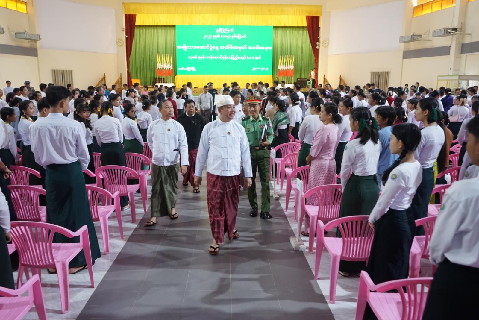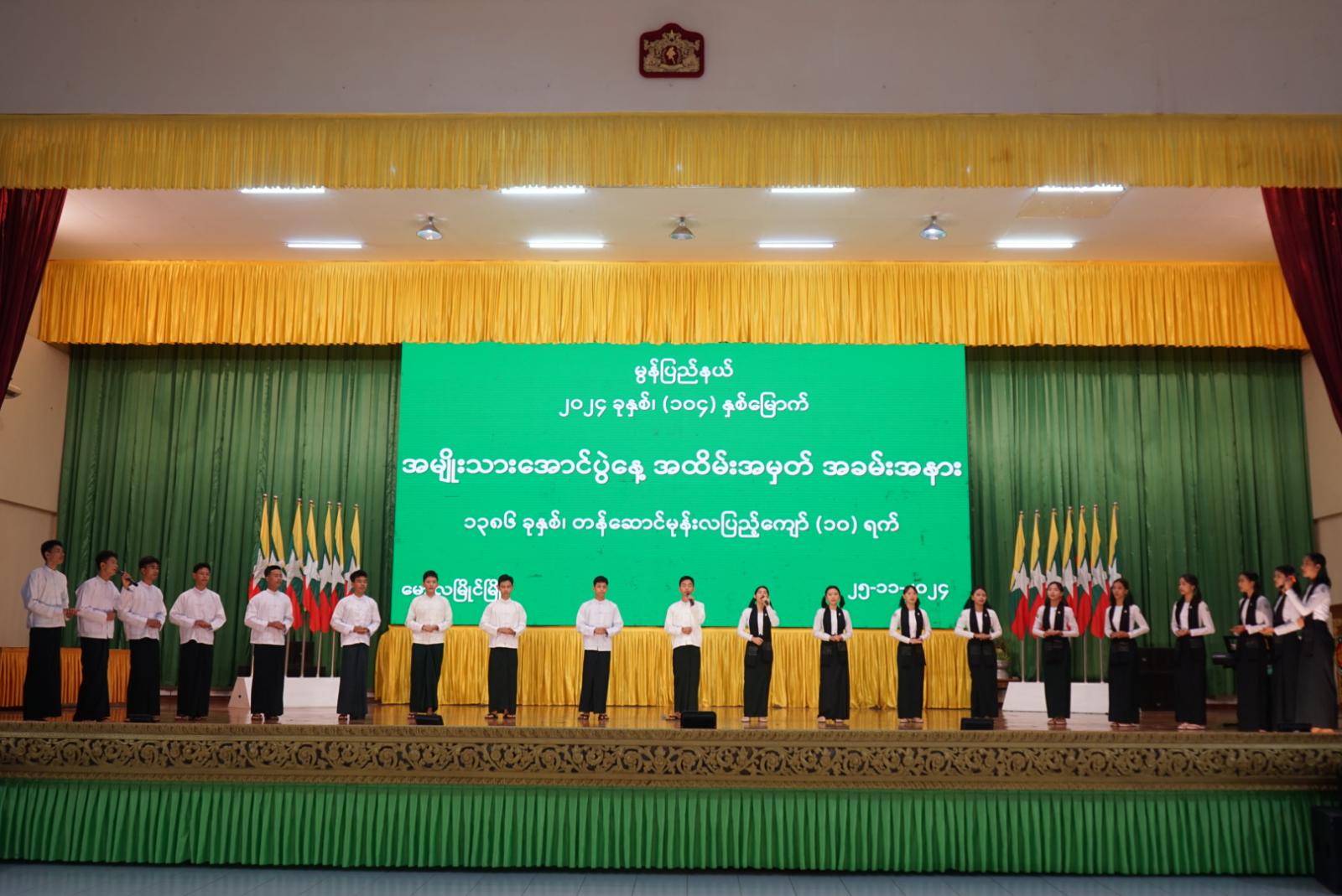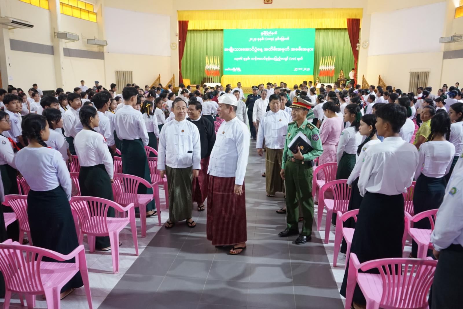 ဆက်လက်၍ အမှတ်(၁၀)အခြေခံပညာအထက်တန်းကျောင်းမှ ကျောင်းသူလေးများက “မြန်မာ့ကျောင်း” သီချင်းဖြင့် သီဆိုဖြေဖျော်၍ အခမ်းအနားကို ရုပ်သိမ်းခဲ့ပြီး ပြည်နယ်ဝန်ကြီးချုပ်၊ ပြည်နယ်တရားလွှတ်တော် တရားသူကြီးချုပ်၊ ပြည်နယ်အစိုးရအဖွဲ့ဝင်ဝန်ကြီးများက တက်ရောက်လာသော ကျောင်းသား၊ ကျောင်းသားများအား ရင်းရင်းနှီးနှီး လိုက်လံနှုတ်ဆက်ခဲ့ကြောင်း သိရှိရသည်။
