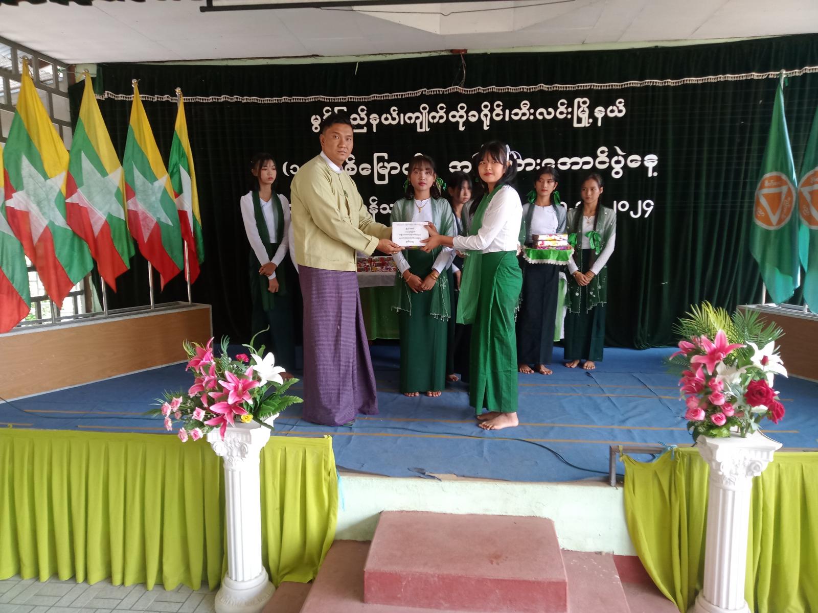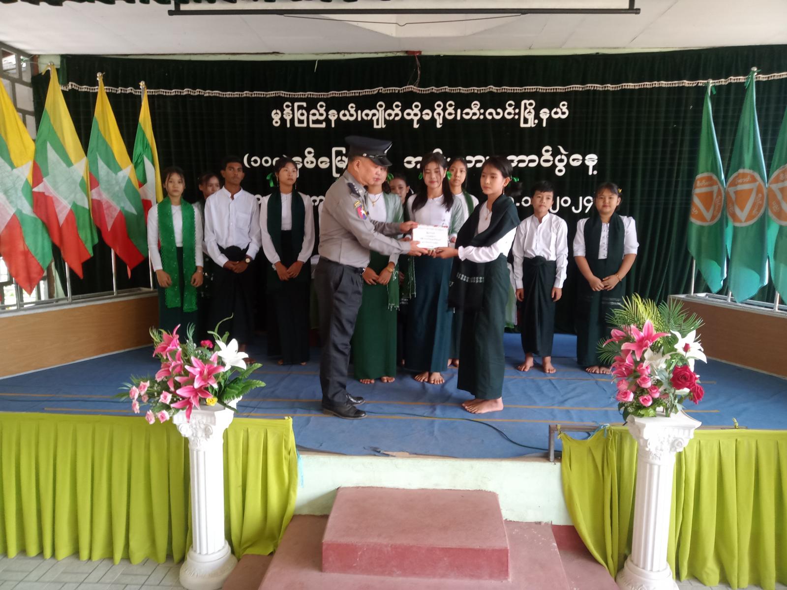 ဆက်လက်၍ ဆုပေးပွဲအခမ်းအနားကို ကျင်းပပြုလုပ်ခဲ့ရာ (၁၀၄)နှစ်မြောက် အမျိုးသားအောင်ပွဲနေ့ အထိမ်းအမှတ် အထက်တန်း၊ အလယ်တန်း၊ မူလတန်းအဆင့် စာစီစာကုံးပြိုင်ပွဲနှင့် ကဗျာပြိုင်ပွဲတွင် ဆုရရှိကြသော ကျောင်းသား/ ကျောင်းသူလေးများကို မြို့နယ်အုပ်ချုပ်ရေးမှူး ဦးစည်သူအောင်၊ မြို့နယ်ရဲတပ်ဖွဲ့မှ ဒုရဲမှူးကျော်လှထွေး၊ မြို့နယ်ပညာရေးမှူး ဦးဝင်းရှိန်တို့က ဂုဏ်ပြုဆုများ ပေးအပ်ချီးမြှင့်ခဲ့ပြီး ကန်သာယာ ကျောင်းသား၊ ကျောင်းသူလေးများက မြန်မာ့ကျောင်းသီးချင်းဖြင့် သီဆိုဖျော်ဖြေကာ အခမ်းအနားကို ရုတ်သိမ်းခဲ့ကြောင်း သိရသည်။