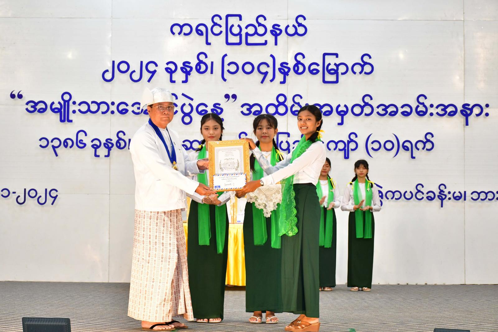 ထို့နောက် ပြည်နယ်ဝန်ကြီးချုပ်၊ ပြည်နယ်အမျိုးသမီးရေးရာအဖွဲ့နာယက၊ ပြည်နယ်တရားလွှတ်တော်တရားသူကြီးချုပ်၊ ပြည်နယ်အစိုးရအဖွဲ့ဝင်ဝန်ကြီးများက အမျိုးသားအောင်ပွဲနေ့အထိမ်းအမှတ် အထက်တန်း၊ အလယ်တန်းအဆင့် စာစီစာကုံး၊ ကဗျာ၊ ပန်းချီပြိုင်ပွဲများတွင် ဆုရကျောင်းသား၊ ကျောင်းသူများအား ဂုဏ်ပြုဆုများ ပေးအပ်ချီးမြှင့်ကြပြီး အမှတ် (၄) အခြေခံပညာအထက်တန်းကျောင်းမှ ကျောင်းသား၊ ကျောင်းသူများက မြန်မာ့ကြွေးကြော်သံသီချင်း၊ အမှတ် (၁) အခြေခံပညာအထက်တန်းကျောင်းမှ ကျောင်းသား၊ ကျောင်းသူများက မြန်မာ့ကျောင်းသီချင်းတို့ဖြင့် သီဆိုကပြဖျော်ဖြေကြသည်။