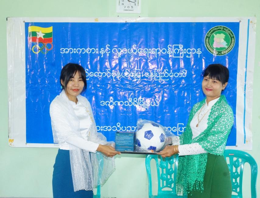 ထို့နောက် အားကစားနှင့်ကာယပညာဦးစီးဌာနမှ တာဝန်ရှိသူများက အားကစားပစ္စည်းများကိုပေးအပ်ရာ ကျောင်းအုပ်ဆရာမကြီးမှ လက်ခံရယူသည်။