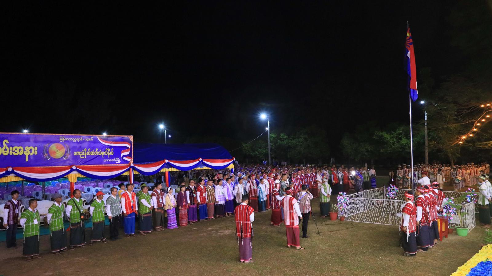 ထို့နောက် သဘာပတိကရင်ပြည်နယ်စီးပွားရေးရာဝန်ကြီးဦးစောခင်မောင်မြင့်က ရောင်နီလာချိန်တွင် ကရင်အမျိုးသားအလံကို တိုင်ထိပ်သို့လွင့်ထူပေးရာ ကရင်အမျိုးသားအပေါင်းတို့က ကရင်အမျိုးသားသီချင်းကို စုပေါင်းသီဆိုကြပြီး ကရင်အမျိုးသားအလံတော်ကိုအလေးပြုကြကာ တွဲဖက်အခမ်းအနားမှူးက ကရင်အမျိုးသား အလံတော်သမိုင်းကြောင်းအကျဉ်းကို (ပိုးကရင်၊ စကောကရင်၊ မြန်မာဘာသာတို့ဖြင့်) ဖတ်ကြားသည်။
