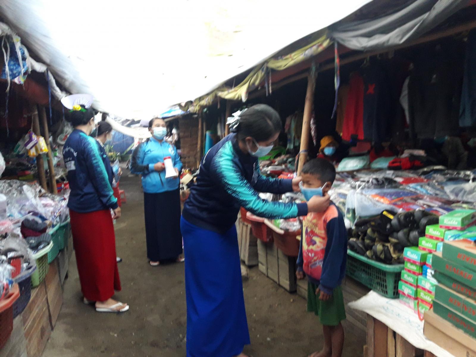ကိုဗစ်-၁၉ ရောဂါ ကြိုတင် ကာကွယ်ထိန်းချုပ်နိုင်ရေးအတွက် ကျန်းမာရေးနှင့် အားကစား ဝန်ကြီးဌာန၏ ညွှန်ကြားချက်နှင့်အညီ လိုက်နာဆောင်ရွက်ကြရန်၊ စနစ်တကျ လက်ဆေး ကြရန်၊ ယခုအချိန်တွင် ကိုဗစ်-၁၉ ရောဂါ ပိုးကူးစက်ပြန့်နှံ့မှုနှုန်းသည် လျော့နည်းသွားခြင်း မရှိသေးသည့်အတွက် ချမှတ်ထားသည့် စည်းကမ်း ချက်များကို လိုက်နာကြရန် နေအိမ်ပြင်ပ ထွက်ခွာပါက Mask တပ်ဆင်ပြီးမှသာ ထွက်ခွာကြရန် ဈေးဝယ်သူနှင့် ဈေးရောင်းချသူများကို ကျေးလက်ကျန်းမာရေးဆရာမ ဒေါ်ဆိုင်းနန်၊ သားဖွားဆရာမ ဒေါ်ရီနွယ်ဝင်းနှင့် ဆရာမ များက Hand Speaker ဖြင့် လူစည်ကားရာ ဈေးတွင် အသိပညာပေးနိုးဆော်ကြပြီး နှာခေါင်းစည်း Mask အခုရေ ( ၅၀၀ )ကို အခမဲ့ဖြန့်ဝေပေးခဲ့ကြောင်း သိရသည်။