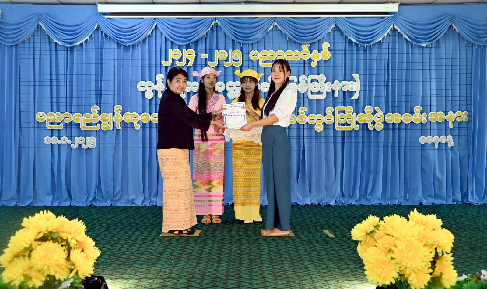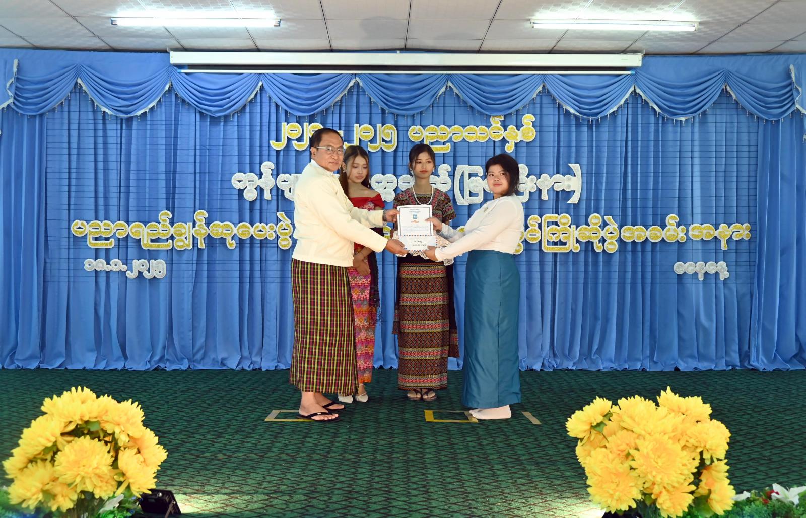 ဆက်လက်၍ ကွန်ပျူတာတက္ကသိုလ် ပဉ္စမနှစ်ကျောင်းသားတစ်ဦးက ကြိုဆိုနှုတ်ခွန်းဆက်စကား ပြောပြောကြားရာ ပထမနှစ်တက်ရောက်ကြမည့် ကျောင်းသား/ကျောင်းသူများ ကိုယ်စား ကျောင်းသားတစ်ဦးက ကျေးဇူးတင်စကားပြန်လည်ပြောကြားပြီး ပညာရည်ချွန်ဆုများကို ပေးအပ်ချီးမြှင့်ရာ ပြည်နယ်တရားလွှတ်တော် တရားသူကြီးချုပ် ဒေါ်အေးအေးမော်နှင့် ပြည်နယ်အစိုးရအဖွဲ့ဝင်ဝန်ကြီးများ၊ ပြည်နယ်ဥပဒေချုပ်တို့က ပထမနှစ်၊ ဒုတိယနှစ်၊ တတိယနှစ်၊ စတုတ္ထနှစ်နှင့် ပဉ္စမနှစ် စသည့် သင်တန်းနှစ်အလိုက် ပထမ၊ ဒုတိယနှင့် တတိယဆုရ ကျောင်းသား၊ ကျောင်းသူများနှင့် (၇၆)နှစ်မြောက် ကချင်ပြည်နယ်နေ့ အထိမ်းအမှတ် အဆင့်မြင့်ပညာအဆင့် စာစီစာကုံးပြိုင်ပွဲတွင် ဆုရထူးချွန်ကျောင်းသားတို့အား ဂုဏ်ပြုမှတ်တမ်းလွှာနှင့် ဂုဏ်ပြုချီးမြှင့်ငွေများကို အသီးသီးပေးအပ်ချီးမြှင့်ခဲ့ကြပြီး ကျောင်းသား/ကျောင်းသူများ၏ တိုင်းရင်းသားရိုးရာ တေးသရုပ်ဖော်အကအလှများဖြင့် ဖျော်ဖြေတင်ဆက်မှုကို အားပေးကြည့်ရှုခဲ့ကြကြောင်း သိရသည်။