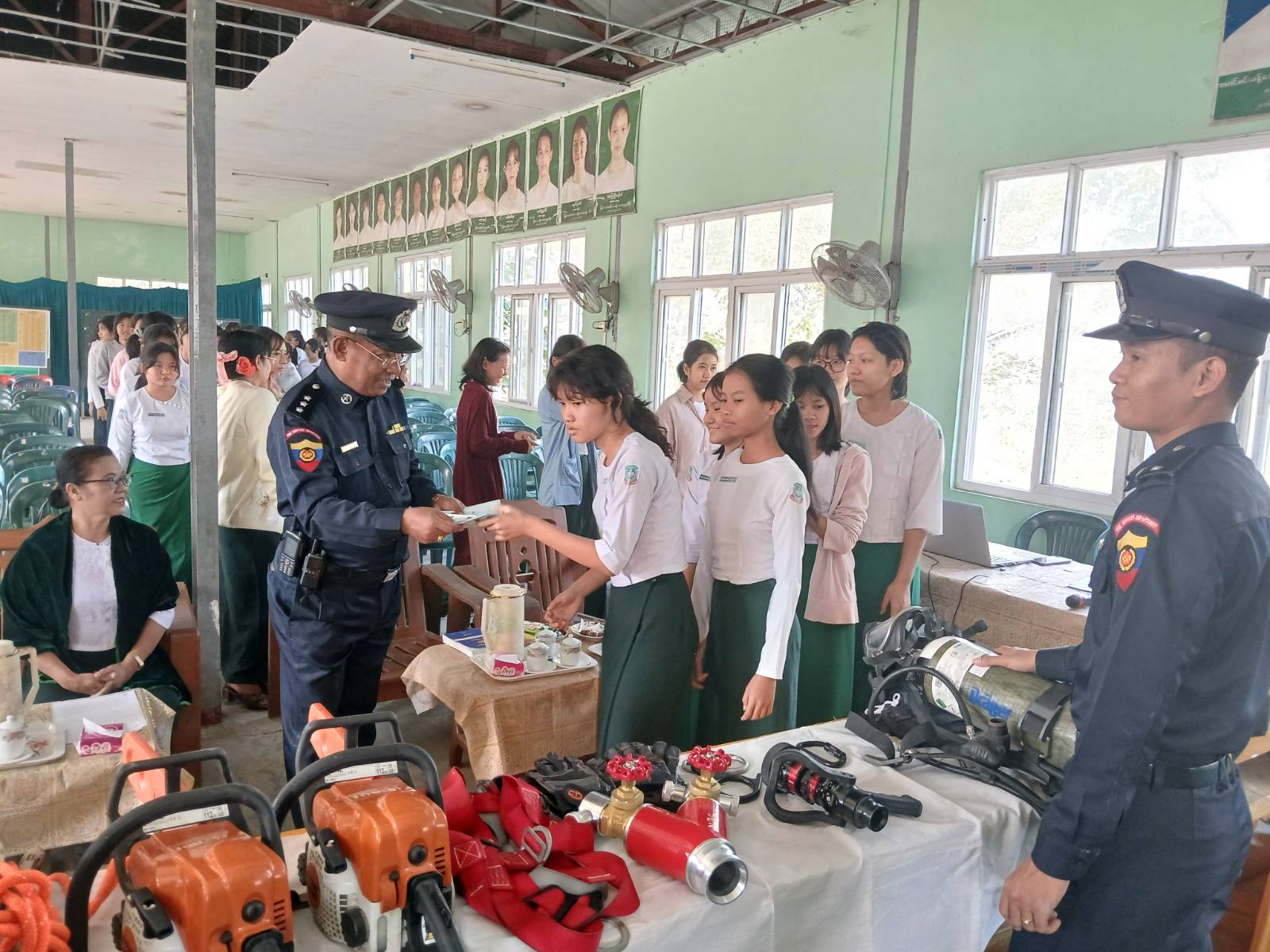 ထို့နောက် အမှတ်(၃)အခြေခံပညာအထက်တန်းကျောင်းမှ ကျောင်းအုပ်ဆရာမကြီး ဒေါ်မူမူလှက ကျေးဇူးတင်စကားပြောကြားခဲ့ပြီး မြို့နယ်မီးသတ်ဦးစီးဌာနမှ သန္ဓေမီးသတ်တပ်ဖွဲ့ဝင်(၁၀)ဦး၊ အရန်မီးသတ်တပ်ဖွဲ့ဝင်(၅)တို့က ခင်းကျင်းပြသထားသော မီးသတ်ပစ္စည်းကိရိယာများအား လက်တွေ့သရုပ်ပြသခြင်း၊ DCP မီးသတ်ဆေးဘူးဖြင့် လက်တွေ့မီးငြှိမ်းသတ်မှုပြသခြင်း၊ မီးသတ်ယာဥ်စက်မှ ရေပက်ဖြန်းငြှိမ်းသတ်မှုများကို လက်တွေ့သရုပ်ပြသခဲ့သည်။