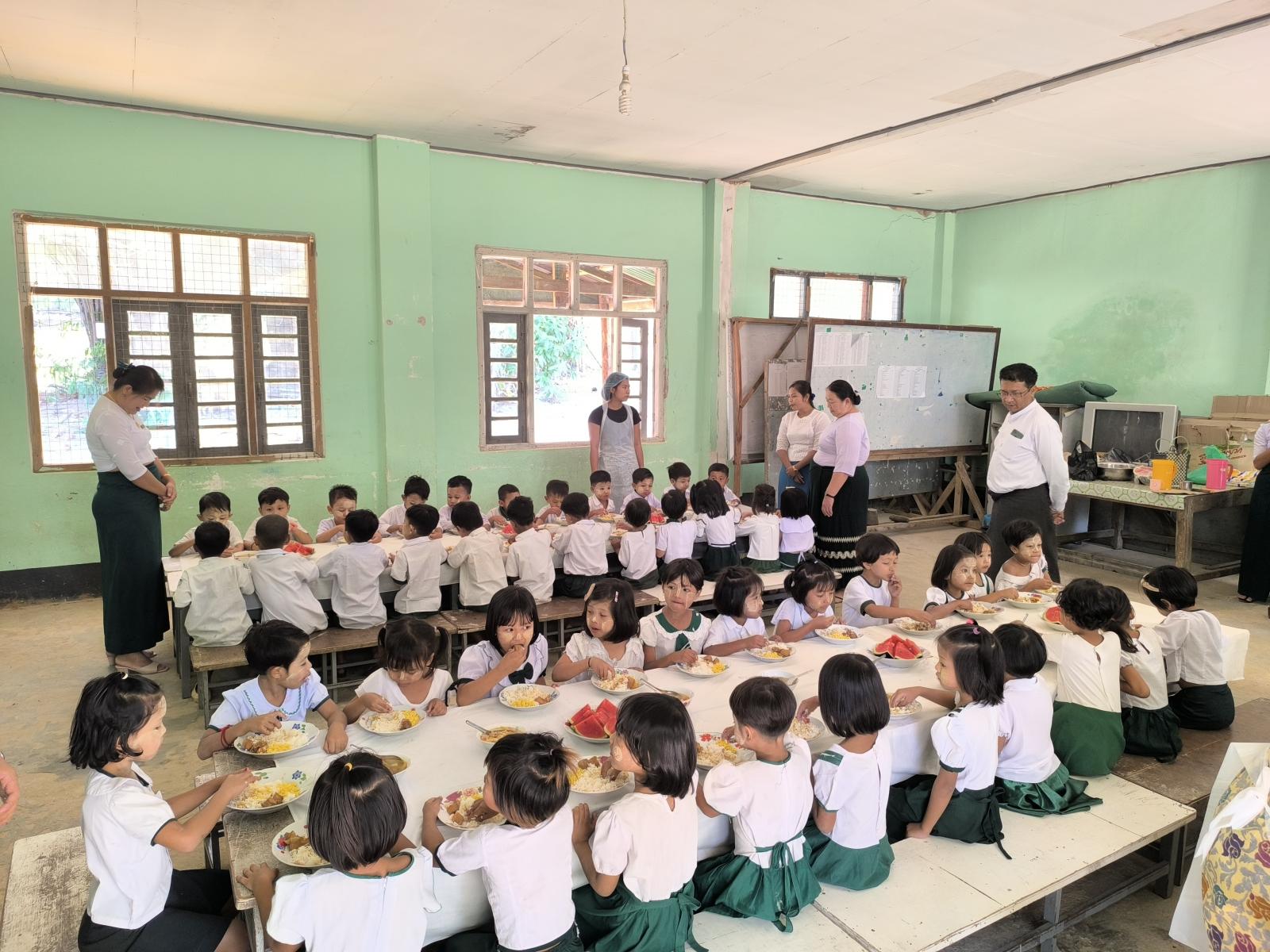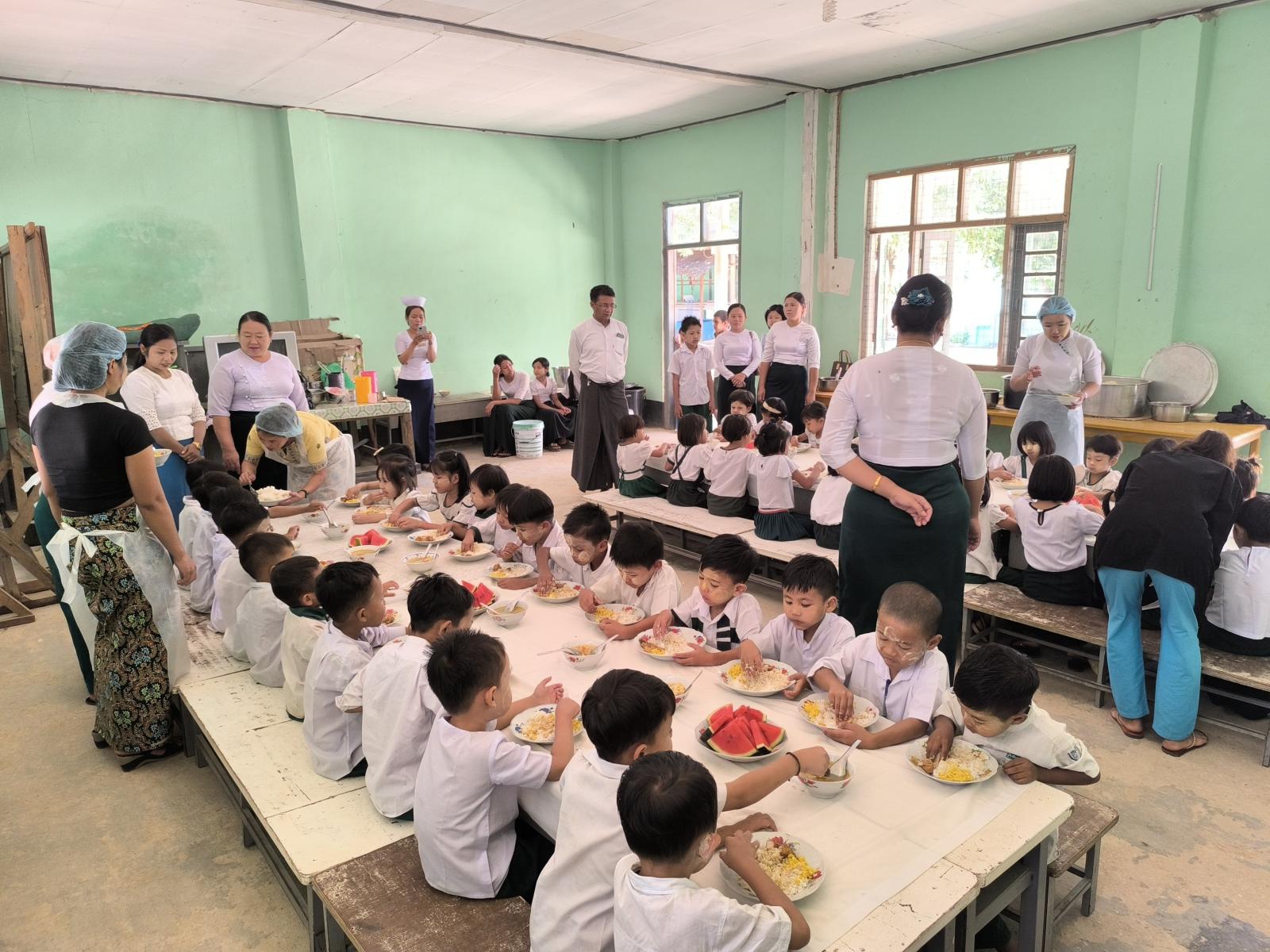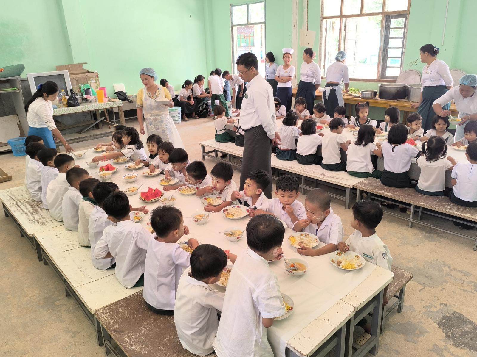 ကျွေးမွေးရာတွင် အာဟာရပြည့်ဝမျှတပြီး ကျန်းမာရေးနှင့်ညီညွတ်သော အစာအာဟာရများကို ချက်ပြုတ်ပြင်ဆင်၍ မြို့နယ်ပြည်သူ့ကျန်းမာရေးဦးစီးဌာနမှူး ဒေါက်တာရဲမင်းဦး၊ မြို့နယ်ပညာရေးမှူး ဒေါ်နုနုလွင်၊ ကျောင်းအုပ်ကြီး ဒေါ်ဌေးဌေးဝင်းနှင့် တာဝန်ရှိသူများက KG ကျောင်းသား၊ ကျောင်းသူ ကလေးငယ်များအား နေ့လယ်စာကျွေးမွေးခဲ့ကြသည်။