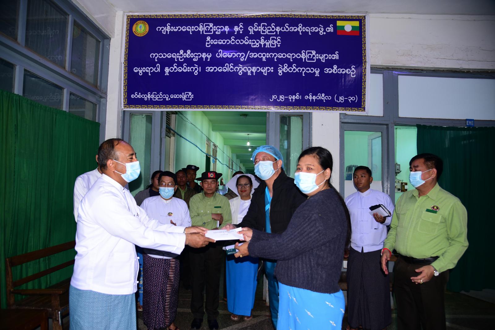 အဆိုပါ တောင်ကြီးမြို့၊ စဝ်စံထွန်းဆေးရုံခုတင်(၅၀၀)၌ ပါမောက္ခ၊ အထူးကုဆရာဝန်ကြီး (၁၁)ဦးမှ မွေးရာပါနှုတ်ခမ်းကွဲ၊ အာခေါင်ကွဲလူနာများခွဲစိတ်ကုသပေးနေမှုကို ဇန်နဝါရီလ(၂၇)ရက်၊ နံနက်(၁၁)နာရီခွဲက ရှမ်းပြည်နယ်အစိုးရအဖွဲ့ ပြည်နယ်ဝန်ကြီးချုပ်ဦးအောင်အောင်၊ ပြည်နယ် သယံဇာတရေးရာဝန်ကြီး ပြည်နယ်ဥပဒေချုပ်၊ ပြည်နယ်အစိုးရအဖွဲ့အတွင်းရေးမှူး၊ တာဝန်ရှိသူ များနှင့်အတူသွားရောက်၍ မွေးရာပါနှုတ်ခမ်းကွဲ၊ အာခေါင်ကွဲကုသမည့် ကလေးလူနာများအား ကြည့်ရှုအားပေးစကားပြောကြား၍ ပြည်နယ်ဝန်ကြီးချုပ်ဦးအောင်အောင်က ခွဲစိတ်ကုသမှုအတွက် ချီးမြှင့်ငွေပေးအပ်ရာ စဝ်စံထွန်းဆေးရုံကြီး တာဝန်ရှိသူနှစ်ဦးမှ လက်ခံရယူကြသည်။
