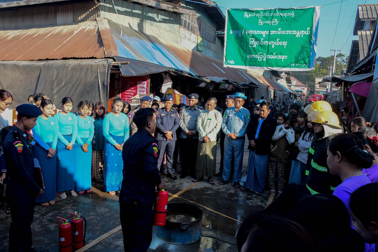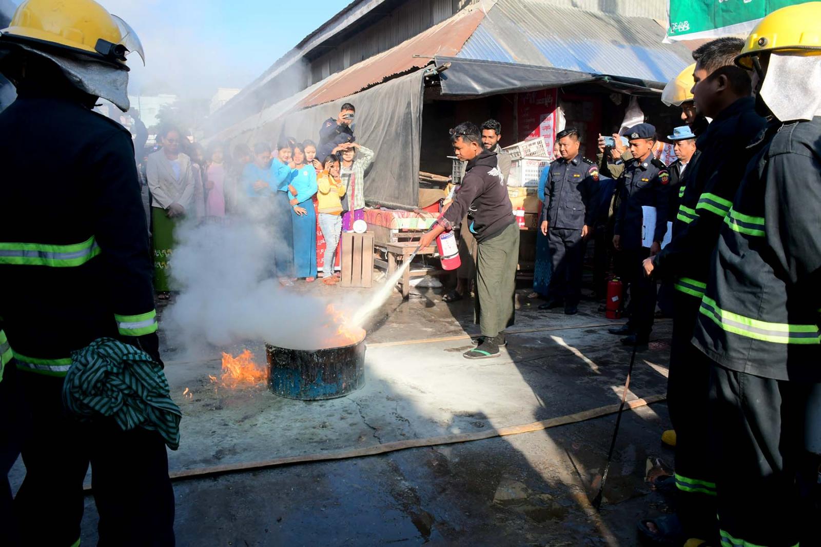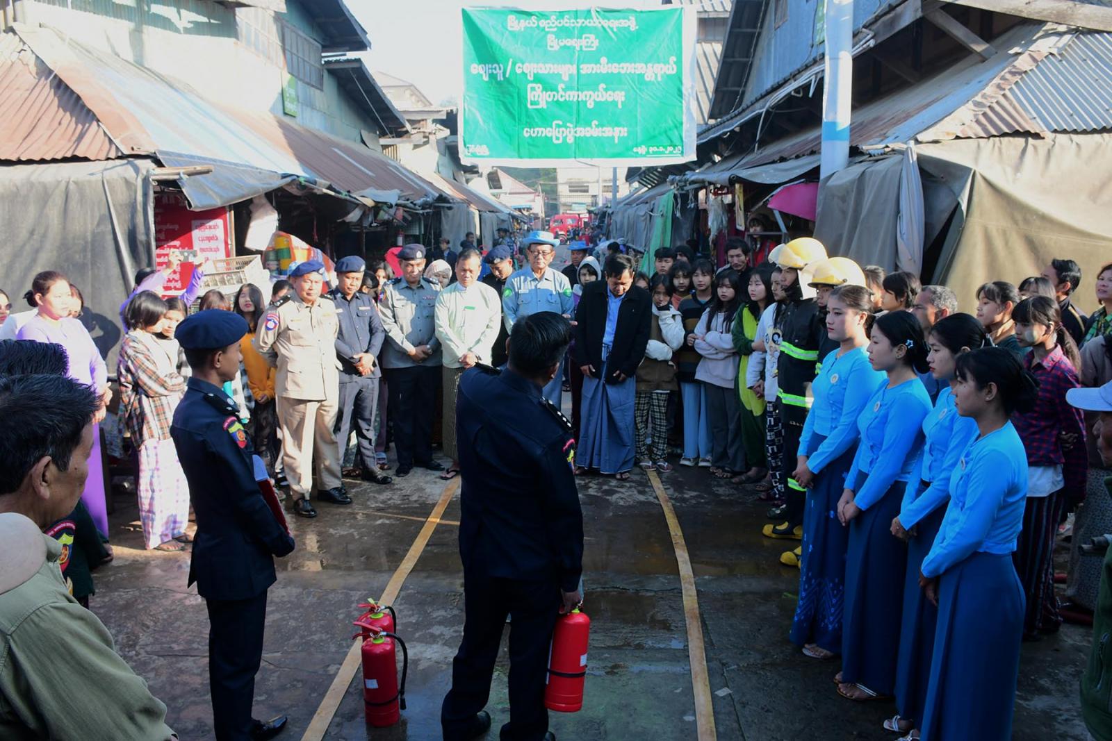 အဆိုပါ မီးဘေးအန္တရာယ် ကြိုတင်ကာကွယ်ရေး လက်တွေ့သရုပ်ပြသခြင်းနှင့် အသိပညာပေး ဟောပြောခြင်းကို မြို့နယ်မီးသတ်ဦးစီးမှူး ဦးအောင်ကိုသန့်က ခရိုင်မီးသတ်ဦးစီးဌာနရဲ့ လမ်းညွှန်ချက်များနှင့်အညီ စည်ပင်သာယာဈေးအတွင်းရှိ ဈေးဆိုင်ခန်းများ မီးဘေးအန္တရာယ် ကြိုတင်ကာကွယ်ရေးအတွက် ဆောင်ရန်/ဆောင်ရန်များ စာတွေ့/လက်တွေ့ ရှင်းလင်းပြောကြားခဲ့ပြီး မီးသတ်ဆေးဘူးဖြင့် မီးငြှိမ်းသတ်နည်းကို ရှင်းလင်းပြသပေးပြီး တက်ရောက်လာသော ဈေးသူဈေးသားများအား လက်တွေ့သရုပ်ပြ ငြှိမ်းသတ်စေခဲ့သည်။