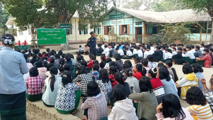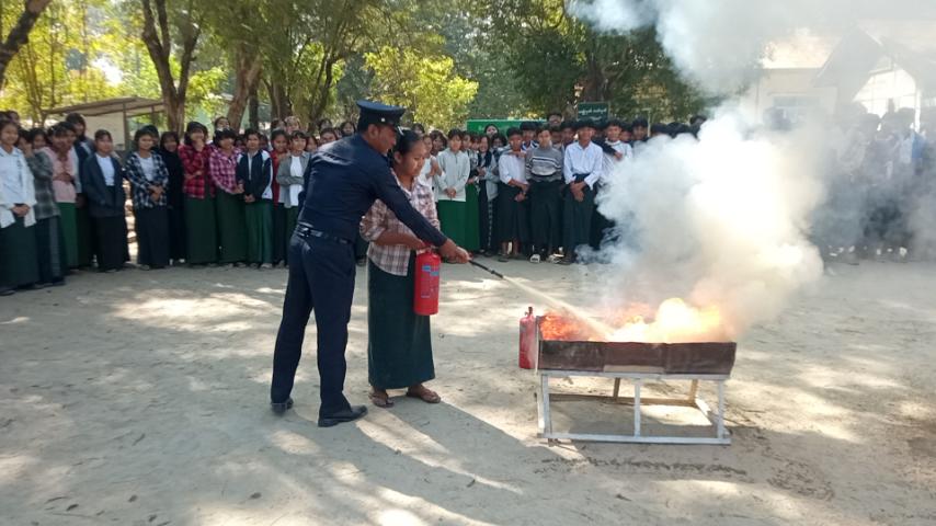 ရှေးဦးစွာ မြို့နယ်မီးသတ်ဦးစီးဌာနမှ ဦးစီးအရာရှိဦးအောင်ကျော်မြင့်က မီးဘေးအန္တရာယ်ကြိုတင်ကာကွယ်ရေး အသိသတိရှိကြစေရန်၊ မီးဘေးအန္တရာယ်ကြုံလာပါက လက်တွေ့လုပ်ဆောင်နိုင်စေရန်ရည်ရွယ်၍ ကျောင်းသား/ ကျောင်းသူများအား အသိပညာပေးဟောပြောခဲ့ပြီး မြို့နယ်မီးသတ်ဦးစီးဌာနမှ သန္ဓေတပ်ဖွဲ့ဝင်များက DCP မီးသတ်ဆေးဘူးဖြင့် မီးငြှိမ်းသတ်ခြင်း လက်တွေ့သရုပ်ပြသသည်။