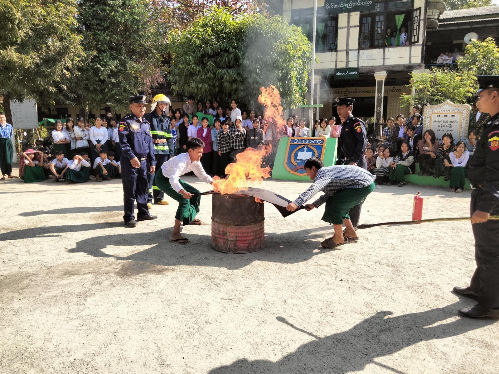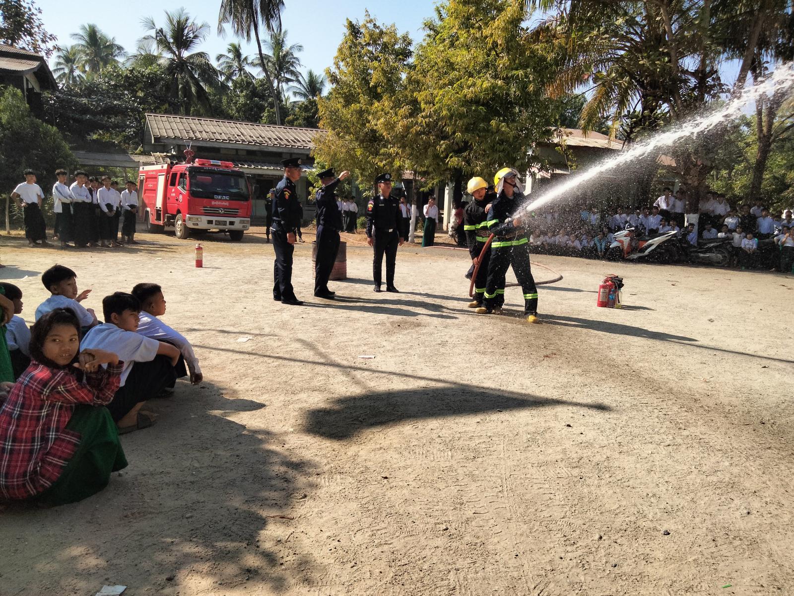 ဆက်လက်၍ လက်တွေ့ဇာတ်တိုက်သရုပ်ပြရာတွင် မီးသတ်တပ်ဖွဲ့ဝင်များက သရုပ်ပြ မီးငြှိမ်းသတ်ခြင်း ကျောင်းသား၊ ကျောင်းသူများက လက်တွေ့မီးငြှိမ်းသတ်ခြင်း မီးသတ်ကားဖြင့် ရေပက်ဖျန်းခြင်းတို့ကို ပြသခဲ့ကြောင်း သိရသည်။