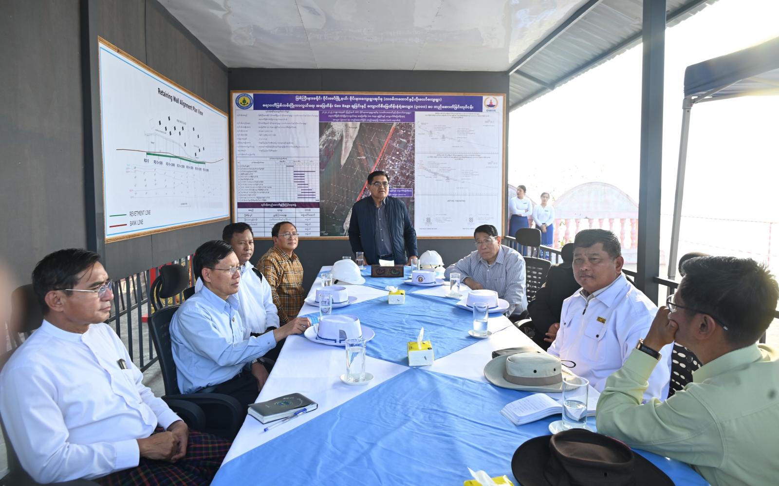 အဆိုပါလုပ်ငန်းစီမံကိန်းနေရာရှိ ကမ်းပါးပြိုကျခဲ့သည့်နေရာ၌ ပြည်နယ်ဝန်ကြီးချုပ်နှင့်အဖွဲ့ဝင်များသည် ဒေသခံကျေးရွာသူ၊ ရွာသားများနှင့်တွေ့ဆုံရာ ပြည်နယ်ရေအရင်းအမြစ်နှင့် မြစ် ချောင်းများဖွံ့ဖြိုးတိုးတက်ရေးဦးစီးဌာန၊ ပြည်နယ်ဦးစီးမှူး ဦးစိန်လွင်က ကမ်းပါးပြိုကာကွယ်ရေး အခြေထိန်း Geo Bag ချခြင်းနှင့် မြစ်ကမ်းပါးထိန်းသိမ်းရေးနှင့် ကျောက်စီမြေထိန်းနံရံ ပေ ၃၀၀၀ တည်ဆောက်လျက်ရှိသည့် လုပ်ငန်းစီမံကိန်းနှင့်စပ်လျဉ်း၍ ရှင်းလင်းတင်ပြပါသည်။